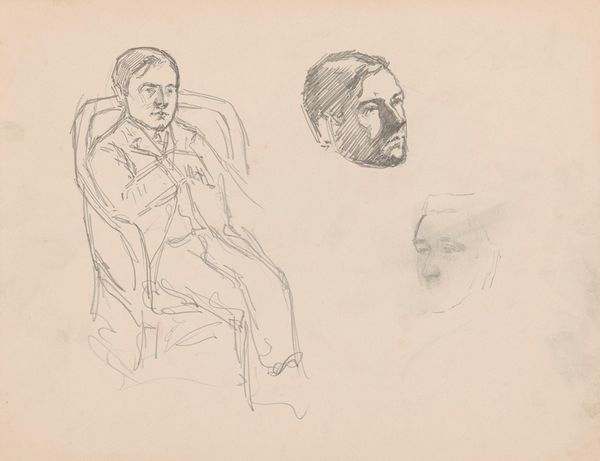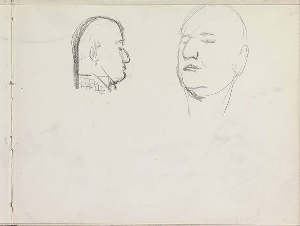 Curator: Here we have Johannes Frederik Engelbert ten Klooster’s work, "Twee portretten van Willem van Konijnenburg," a dual portrait drawn sometime between 1883 and 1940. Editor: These portraits are strikingly austere. The artist has rendered the two profiles in sparse pencil lines, seemingly focused more on capturing a likeness than providing any embellishment. Curator: Indeed. Consider the artist's reliance on line. Notice how each contour is carefully articulated, defining not only the subject's features but also the spatial relationship between them. It emphasizes a certain... stoicism. Editor: Well, thinking about the materiality here, this looks like a simple pencil drawing on paper. One could imagine these sketches were done quickly, perhaps as preparatory studies. This points towards the practical side of artistic labor and challenges preconceived ideas about creating timeless “high art.” What type of paper do you think it is, and how might it contribute to or distract from the drawing? Curator: That's insightful, focusing on production. However, observe how the use of subtle gradations, even within the minimal pencil work, contributes to the creation of depth and form. The hatching technique brings dimensionality into this rather simple composition. Editor: Agreed. Yet, consider where the artist might have found their supplies. Were these high-end pencils and artist-grade paper, readily available only to affluent portrait artists? Was the artist perhaps limited in the quality and cost of materials? Curator: A worthy materialist point, as always! What are you hoping our listeners take away from it? Editor: An attention to process and the importance of how mundane material availability is intrinsically tied to the ability to create fine artworks! Curator: And perhaps a deeper consideration into the inherent beauty embedded into these simplistic works!