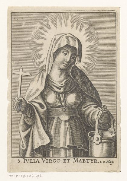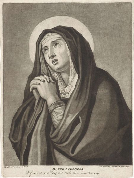 Cornelis Galle I created this engraving, "Zittende Maria met aureool," which translates to "Seated Mary with Halo," sometime between 1596 and 1650. Galle was part of a prolific family of engravers in Antwerp, a city that was then a center of Catholic Counter-Reformation art. Here, Mary is depicted with an expression of delicate sorrow. Her hands are clasped over her heart, suggesting both piety and the anticipation of suffering. Galle’s Mary exemplifies the ideal of feminine virtue promoted by the Catholic Church at the time. The inscription at the bottom translates to "How beautiful you are, how pleasing, my love, with all your delights! Your stature is like that of the palm, and your breasts like clusters of fruit." This quote, drawn from the Song of Songs, connects Mary to themes of beauty, fertility, and divine love. Consider how Galle uses the visual language of the Church to frame Mary not just as a religious icon, but as an emblem of idealized womanhood. Her beauty and sorrow become a mirror reflecting the complex expectations placed on women during this period.