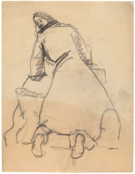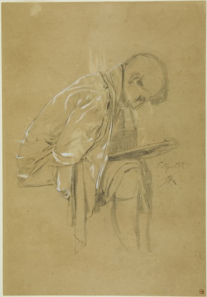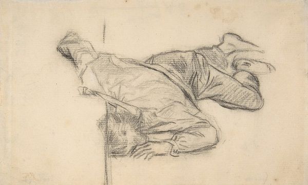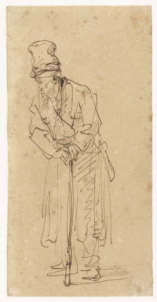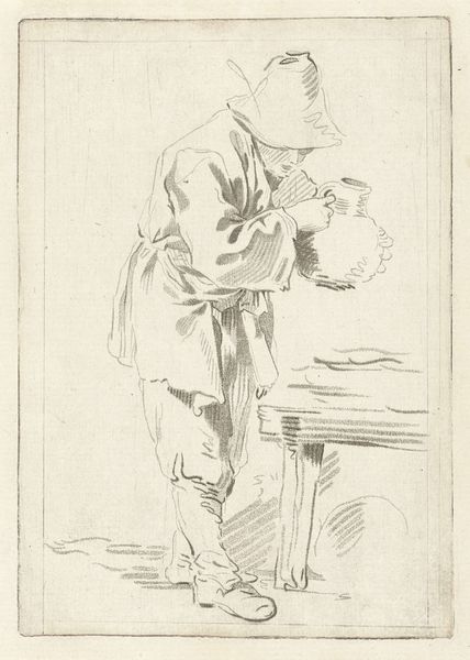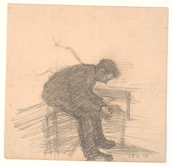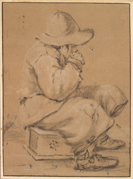Editor: This is "Zittende boer, op de rug gezien, met een been op de bank" – "Seated farmer, seen from the back, with one leg on the bench" – a pencil drawing on paper by Adriaen van Ostade, from sometime between 1659 and 1670. The drawing feels quiet, intimate, a snapshot of everyday life. What do you see in this piece? Curator: I see a potent representation of labor and class within the Dutch Golden Age. Ostade's choice to depict the farmer from the back is significant. It depersonalizes the subject, inviting us to consider him not as an individual, but as a representative of the working class. What does his posture tell you? Editor: He looks exhausted, maybe? Kind of slumped over on the bench... Curator: Exactly. The drawing subtly critiques the social structures of the time. Consider the broader context: The Golden Age was a period of immense wealth for some, but that wealth was built, in part, on the labor of people like this farmer. The artist may subtly imply that while the merchant class was commissioning portraits aggrandizing their wealth and success, who was accounting for the working class on whose back this wealth had been built? Do you see echoes of contemporary issues here? Editor: It definitely makes you think about who benefits from whose work. I guess I hadn't considered how this genre scene could also be a form of social commentary. Curator: It invites questions about representation, power dynamics, and who gets to tell whose story, something artists still grapple with today. Looking at the history can inspire our awareness of injustice now. What are you left thinking about? Editor: How art can speak to power even through simple scenes. And how important it is to question the narratives presented to us. Curator: Precisely. Every image has its place in social movements, revealing silent biases or forgotten histories.