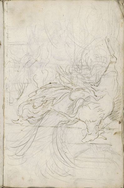 Editor: This intriguing drawing, titled "Studies, mogelijk dood wild of gevogelte," is attributed to Paul de Vos and dates back to sometime between 1605 and 1678. Rendered in pencil on paper, its ghostly imagery leaves me feeling slightly unsettled. What do you see in this piece, particularly in terms of its formal elements? Curator: The composition strikes me as particularly dynamic despite its subdued tonality. Notice the deliberate arrangement of lines, how they coalesce to suggest form and volume, yet remain intentionally incomplete. De Vos masterfully employs the varying pressure of the pencil to create a sense of depth and texture. Do you perceive how the repetition of curvilinear forms guides the viewer's eye throughout the picture plane? Editor: I do see that now! The repeated curves, especially in what I assume are the birds, definitely create a sense of movement. But the lines are so faint, it feels fragile. Curator: Precisely. That fragility, that ethereal quality, arises from the strategic use of line weight and the considered deployment of negative space. The areas left untouched are just as crucial as the marks themselves. In examining the work through this lens, does the subject matter take on a new dimension of meaning? Editor: Yes, definitely. The incompleteness amplifies the feeling of fragility, perhaps mirroring the fleeting nature of life itself, considering the suggested subject. Curator: A keen observation. De Vos provides a lesson in economy of means; suggesting far more than he explicitly depicts. Editor: This close look has really changed my understanding. What initially seemed like a simple sketch now reveals a carefully constructed and emotionally resonant composition. Curator: Indeed. By attending to the intrinsic formal qualities, we gain insight into the artist’s intentionality and, ultimately, a deeper appreciation for the artwork’s evocative power.