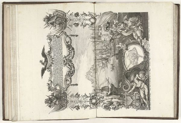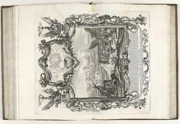Curator: At first glance, this little print—Jean-Baptiste Joseph Delafosse's "Ornament"—feels so contained and formal, doesn't it? A tiny peep-show of idealized nature. Editor: Indeed! The allegorical elements frame the pastoral scene so deliberately, evoking a sense of courtly control over the wildness of nature itself. I see the garlanded wreath—a symbol of victory and celebration—contrasting with the melancholy within the circle. Curator: Fascinating. How does that contrast function for you? Editor: The wreath suggests an attempt to contain or even conquer nature's inherent transience and unpredictability. It speaks volumes about the period’s social and cultural aspirations toward order and mastery. Curator: It's a beautiful tension between control and freedom, isn't it? Delafosse’s ornamental work serves as a window into a complex relationship between art, nature, and power dynamics. Editor: Precisely, and this little window offers so much to unpack.