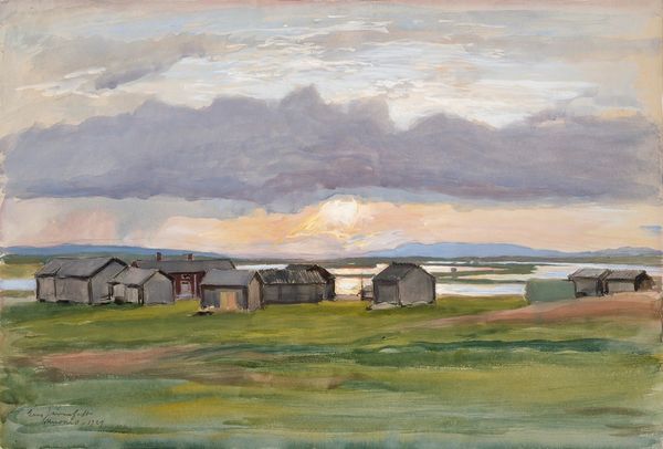 Curator: The prevailing feeling I get is somehow... nostalgic? Industrial nostalgia. It's a strangely serene industrial scene, rendered with very crisp lines. Editor: We’re looking at "Industrial Landscape," an oil painting created around 1950 by David Kakabadze, who lived and worked in Georgia. It’s a remarkably calm cityscape—or, more accurately, an industrialscape—held in a private collection. What visual motifs are speaking to you, as an iconographer? Curator: The factory itself dominates. Long, horizontal. Implying perhaps a slow, steady force, something permanent and unchanging in an otherwise mutable world. Notice the distant mountain range – is it dwarfed by the factory, or does it quietly observe? Editor: That juxtaposition interests me deeply. Kakabadze paints these almost dreamlike, smoky mountains as a backdrop, setting the brick-red factory and its tall smokestack within a vista of nature. He suggests a dialogue between the industrial and the natural. I see the workers in the foreground too – faceless and somewhat anonymous – as tiny figures compared to the monumentality of their labor. Curator: I do love how grounded the painting feels. Despite the smokestack stretching upwards, most of the action occurs on that long horizontal line that is the factory itself. It keeps the eye moving across the canvas. Are there other symbols we should be picking up on? Editor: The steam train, perhaps, a potent symbol of progress, movement, and even disruption. Consider the train against the manual labor we see in the field. One’s mechanical, one is profoundly human. Both shaping the landscape. Together, they signify transition. It's fascinating to think about what these industrial images represented for viewers then versus what they represent now. Curator: Absolutely. When I look at that smokestack against the bright sky, it does force me to wonder what it would have meant for the artist, for the workers, and for society at large. In a sense, a painting like this freezes a specific cultural tension, giving us something to ponder for a good long while. Editor: Precisely. And whether the prompt is technological optimism or ecological grief, this painting insists on an unfolding story.