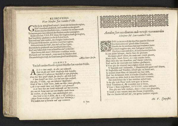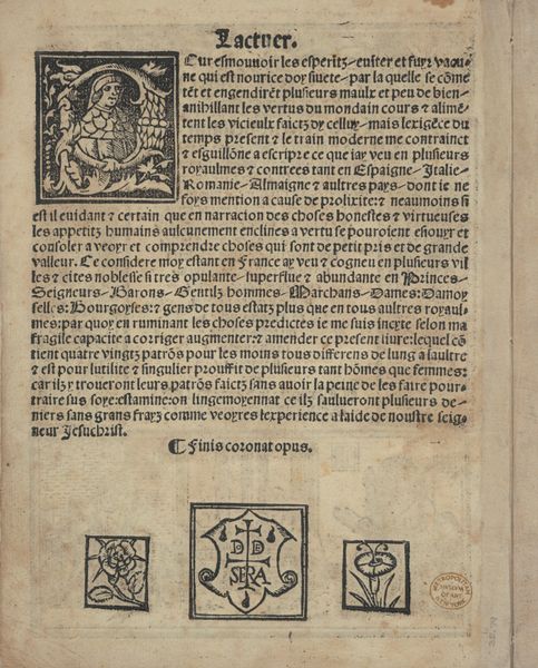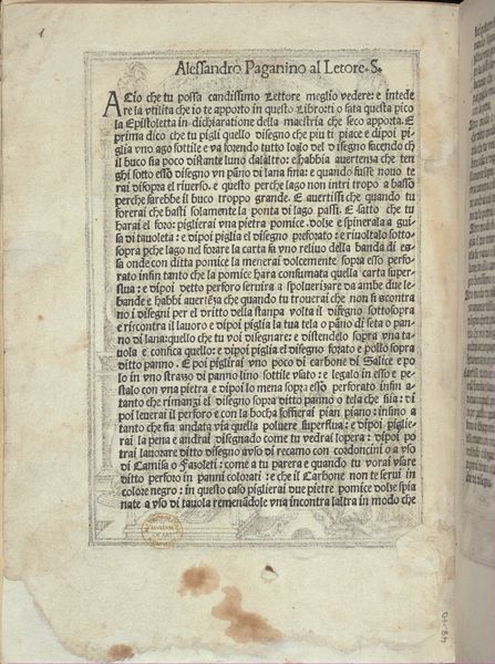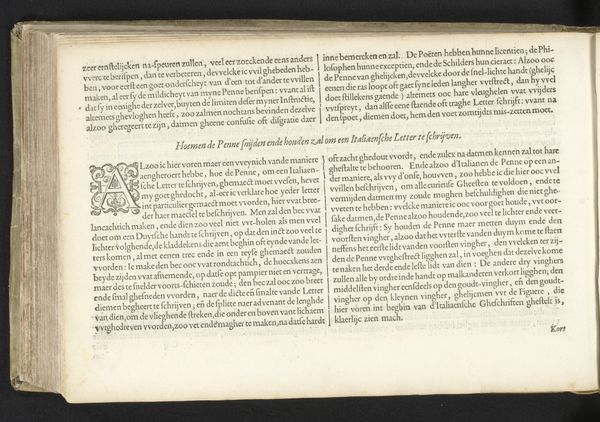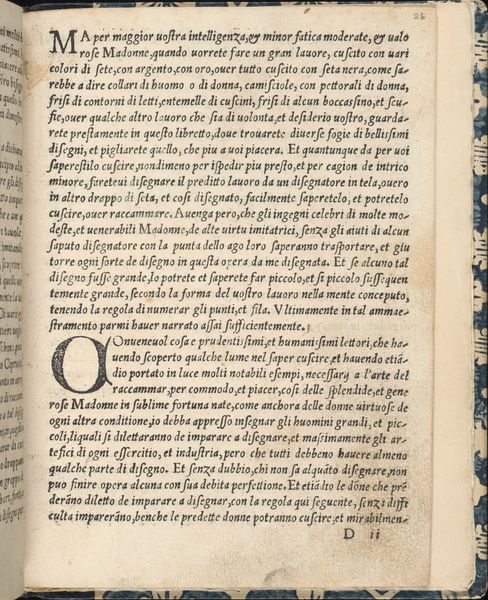 Curator: Let’s turn our attention to a page from Giovanni Antonio Tagliente’s *Essempio di recammi*, created around 1530. Editor: The stark black-and-white contrasts immediately grab me. The text feels dense, almost claustrophobic, but the glimpses of illustrations offer small reprieves. It's very focused on the techniques and labor necessary for production. Curator: Indeed. Tagliente’s work is incredibly important because it gives insight into the world of Renaissance needlework and its connection to feminine education and cultural values of the time. This page is essentially a pattern book, instructing women in the intricate techniques of embroidery. Notice the elaborate initial “R.” Editor: Absolutely! This wasn’t just about aesthetics; needlework was a craft—a skill—and books like this directly impacted what women could produce and contribute within their households and, by extension, to commerce. Can you imagine the time spent learning each stitch? The materiality is key: linen, silk, metal threads; all transformed through practiced labor. Curator: Precisely! And think about the social expectations embedded within this labor. It highlights the intersection of skill, gender, and class. Women, constrained by societal roles, found a means of creative expression and, potentially, economic contribution, using patterns like these. The very act of embroidering these patterns allowed for creative license and, perhaps, a subversive interpretation of prescribed roles. Editor: It really highlights the dual nature of these kinds of domestic crafts; they confine, but also empower. The labor, material and instruction encoded within a small, practical object open so many discussions on skill and technique! Curator: Exactly. Examining Tagliente’s book through the lens of cultural expectations and practical skills shows how the personal, creative labor becomes intrinsically linked with identity formation and gendered expectations within Renaissance society. Editor: It prompts us to consider what happens when we view domestic labor as culturally and economically important practices—practices with both creative skill and great amounts of effort required. Curator: A deeper look helps us understand not only the skills of women, but also the intricate web of power and creativity intertwined within seemingly simple acts of artistic craft.