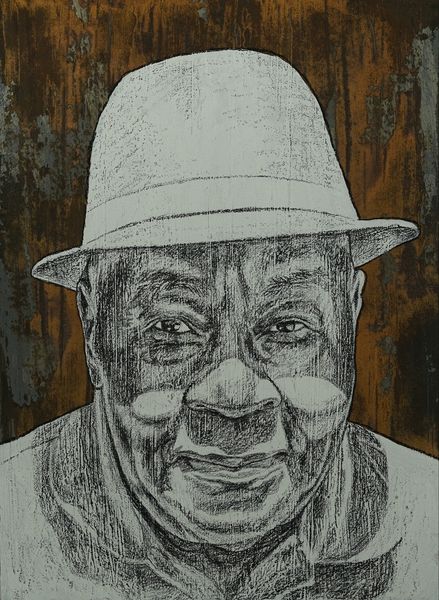 Alfred Conteh created 'Jake' using mixed media on wood panel. Conteh's work is deeply embedded in his experience of being a Black man in America, and his art is a powerful commentary on identity, community, and history. This portrait challenges the traditional representations of Black men, offering a nuanced perspective that acknowledges both the weight of societal expectations and the resilience of the individual spirit. The cracking effect of the wood panel adds a layer of complexity, perhaps symbolizing the fractures within society or the challenges faced by his subjects. Conteh has said "My works are characterizations of people within my community", which are rooted in observations that reflect the everyday lives and struggles, but also the strength and dignity, of the people around him. 'Jake' invites you to consider the emotional and personal dimensions of the Black experience, and how the weight of history shapes individual identity.