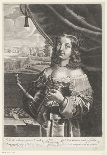 Jean Leblond's engraving, Melpomene, now held at the Rijksmuseum, was created sometime in the mid-17th century. This print alludes to the Greek muse of tragedy through its inscription and the prominent display of a stringed instrument. But how might we understand this work as a product of its specific time and place? France in the 1600s was a society steeped in courtly culture, where the arts served as a vital tool for projecting power. Leblond, working as an engraver, produced images for a print market that was increasingly shaped by royal patronage and academic standards. Looking closely, we can see the sitter is fashionably dressed, suggesting she is of a wealthy social standing. A woman playing an instrument, would also connote status. The verses inscribed at the bottom of the piece, may also speak of her fate in life. To further understand the nuances of this piece, historians might consult period literature on musical aesthetics or delve into the archives of institutions like the Académie Royale de Peinture et de Sculpture, founded during Leblond's lifetime. Such research helps us appreciate how art both reflected and shaped the social structures of its time.