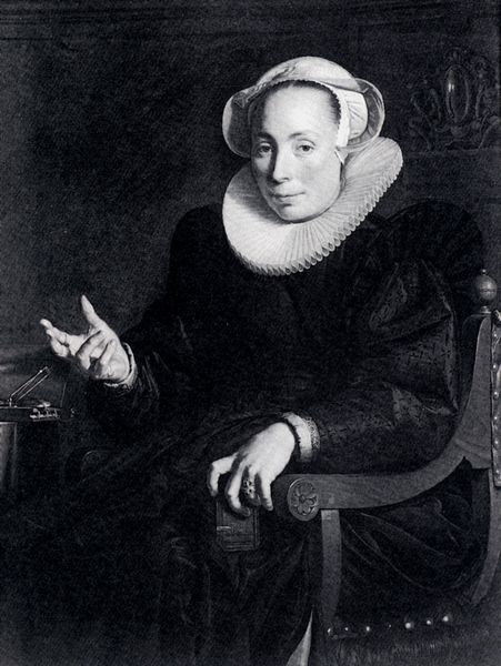 Editor: We are looking at "Portrait Of Christina Wtewael Van Halen," painted by Joachim Wtewael sometime between 1568 and 1629, using oil paint. What strikes me is the intense focus on her face; her dark clothing and the background fade away, which allows her face to dominate our reading of the work. How do you interpret the visual dynamics here? Curator: Let’s consider the formal relationships within the painting. Note the stark contrast between the tight ruff and bonnet and the subject's face, a bright, almost spherical form. This immediately draws the eye. How does the artist's treatment of light contribute to this effect? Editor: I think it has something to do with the fact that the background and most of her outfit seem to disappear into shadow, but her face, hands, and parts of the chair, for example, have these glints of light. Curator: Precisely. Now observe the gestural qualities. One hand presents itself to the viewer, seemingly interrupted mid-gesture. What meaning do you draw from its placement in relationship to the other elements? Editor: Well, it seems to be both an invitation and a way for the viewer to be brought into the space, without ever truly entering the space of the sitter. She seems at once welcoming but removed from us. Curator: An interesting observation. Furthermore, analyze the artist's deliberate brushstrokes and textural rendering. Notice how the rendering of fabric is highly detailed, while certain areas fade into looser forms. How does this serve the work's purpose? Editor: Maybe it brings attention to the detail and to what the artist sees as worthy of the attention? The eye is brought to what’s sharper, more realistic. I wouldn't have thought about how texture plays a part until you brought it up, though. Curator: It highlights the inherent visual structure. It’s the manipulation of these elements—line, light, gesture—that constitute the artistic message and merit the art itself. Editor: Seeing this from the point of view of its lines and composition gives me new insight into not just the art, but how to engage with it.
