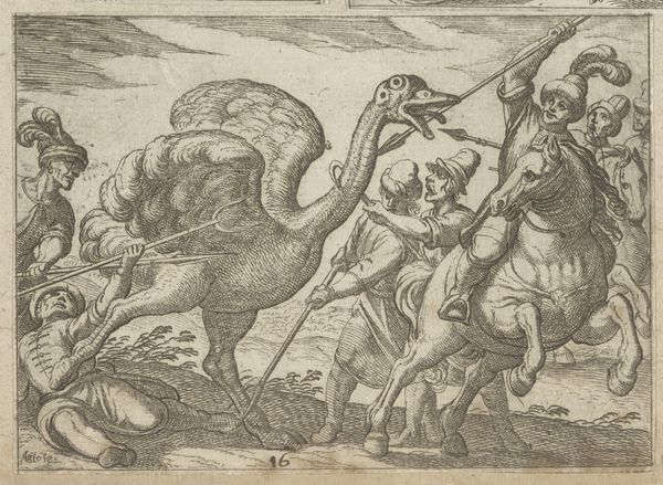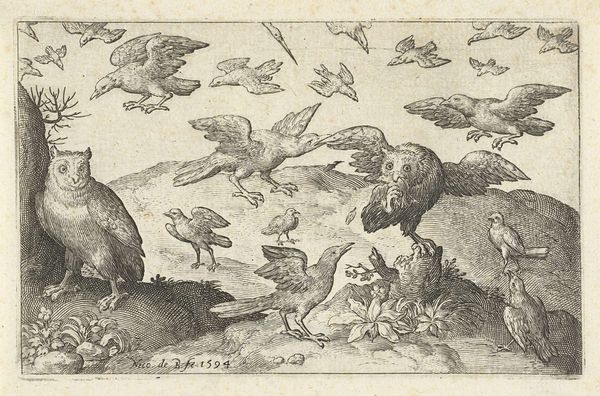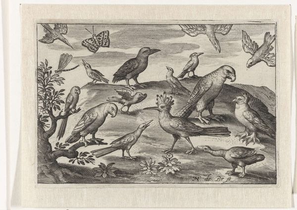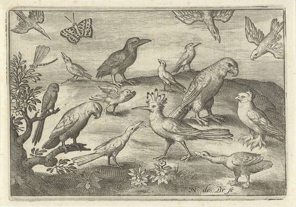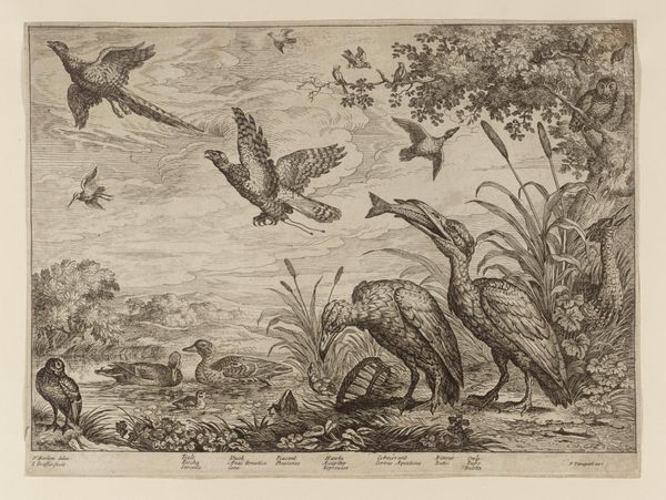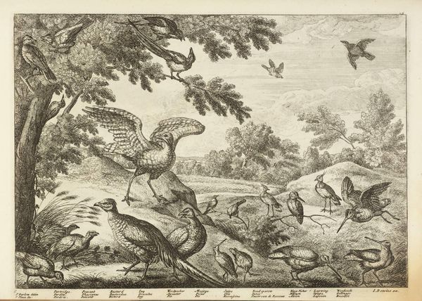 Jan Griffier created this print, "Verschillende vogels en een aap," using etching, a process that democratized image production in the 17th and 18th centuries. Here, Griffier presents us with a landscape populated by an array of birds and a monkey, seemingly observed through the lens of scientific curiosity, yet steeped in the period's colonial gaze. The attention to detail in rendering each species reflects a burgeoning interest in natural history, fueled by exploration and the desire to classify the natural world. But, for whom was this nature being classified? The presence of exotic animals invites us to consider the cultural and economic exchanges that shaped the era. While offering a glimpse into the wonders of the natural world, this image also reflects the power dynamics inherent in exploration, trade, and the human desire to dominate nature. It invites us to reflect on the complex relationship between observation, knowledge, and control.