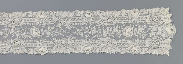 This is a length of mixed lace with a rose hedge design by Martha Berkers. Its creamy colour and delicate texture give it an ethereal quality. The rhythmic arrangement of rose motifs and foliage along the lace strip highlights the structured yet organic composition. The use of negative space, created by the openwork of the lace, is as important as the material itself; these gaps form a semiotic system, evoking the sense of transparency and fragility associated with lace. This piece isn't just decorative; it embodies the cultural codes of femininity, luxury and craftsmanship. Berkers's careful attention to the details destabilizes the traditional notions of lace as merely ornamental, elevating it to a sophisticated commentary on form and function. The interplay between the intricate pattern and structural design encourages us to see beyond its surface and recognize its deeper artistic intent.