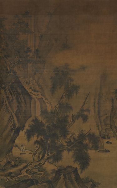 Curator: The artwork we are observing here is titled "Bamboo", originating from Japan, sometime between 1475 and 1573, attributed to the artist Kao, and created using watercolour on toned paper. Editor: There is something serene, but also stoic, about this image. The restrained color palette focuses your eye, giving a sense of aged resilience to the stalk. Curator: That’s a very interesting way to put it, resilience is key here! The bamboo stalk symbolizes not only strength and flexibility in the face of adversity but is also related to a concept of cultural identity for Japan, a profound image of constancy. Editor: It makes me think about how these natural images—bamboo, water, mountains— become such politically loaded emblems, signifiers of the nation, and how those ideals impact people. What gets highlighted and what gets obscured in that projection? Curator: That's where we must consider this period; the Muromachi period when this work was made witnessed profound shifts in power, so "Bamboo" can also be understood as the need for survival. The ability to survive turbulent times. Editor: Absolutely, this notion of adaptability is relevant to many forms of precarity in both the past and present, perhaps allowing us to see some of our anxieties reflected in the choices made by the artist. Curator: The interesting factor is the use of watercolor—rather rare for Japanese ink paintings, where monochromatic tones with smooth gradations of ink prevail; however, "Bamboo" leans towards expressive colors that provide depth and, I dare say, individuality. Editor: True. And those delicate yet firm strokes speak to me of the tension between fragility and endurance in human experiences, but how the canon privileges masculine qualities, often relegating these "softer" strengths to the margins of discourse. Curator: On balance, this ink wash painting of the plant that withstands blizzards stands for persistence, yes, but perhaps more simply as nature’s constant presence across the landscape. It is quite simply inspiring. Editor: It seems Kao captured more than simply an artistic rendition of a familiar plant; he seems to reflect the struggles and strengths of his society that echo to this day.