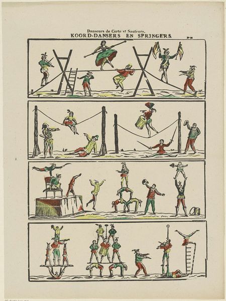 Curator: Let's take a look at this printed work by Glenisson & Van Genechten, titled "Myn knaepjes! deze prent verbeeldt den krijgeren stand, / En toont, 't beleid en moed der dappere soldaten. / Groeit ook zoo walig op voor vorst en vaderland, / Dan zal uw mannen hart geen spoor van lafheid laten." Created sometime between 1833 and 1900, it’s a really interesting example of early narrative art in print. Editor: Whoa. Okay, so first impression: It looks like a slightly chaotic flipbook frame, maybe? All these little soldiers, lines of them… Sort of charmingly militaristic? Like a toy soldier convention gone sideways. Curator: I think "charming" is a great way to put it. Prints like these, circulating in the 19th century, often served to instill patriotic values and offer accessible depictions of military life. Notice the repetition, how the soldiers in formation mirror earlier depictions of officers on horseback. It creates a sense of organized power but within a simple, digestible format. Editor: Definitely see the patriotism baked in – a little heavy-handed for my taste, I confess. All those rows of identical guys with rifles...it's more about uniformity than individuality, right? What strikes me is how they try to suggest motion by repeating nearly identical figures. A stagecoach morphing along with tiny little explosions of landscape behind them! It makes me grin, though. It’s utterly earnest. Curator: And, of course, the text underscores that very intent. It is very direct about encouraging young men to be brave for their country, playing directly into contemporary notions of civic duty and masculinity. These images really helped shape how ordinary people perceived their nation and their place within it. Editor: True, there’s context. But when I really zone in, I just see an artist meticulously scratching out a vision – maybe even someone feeling a touch rebellious doing it? It has that sketchbook quality – a little irreverent against something so stiffly political! What do you suppose the folks who first saw this really made of it, beyond all the State intention, of course? Curator: A complex question, because their understanding would have been filtered through different social norms and patriotic sentiments. But seeing art as a social tool like this opens up a wider discussion about how nations cultivate allegiance and image, from the ground up. Editor: Hmm…Food for thought indeed. Gives a whole new level of “depth” to kids playing with army men…Makes me rethink all kinds of things, not just the visual layers…