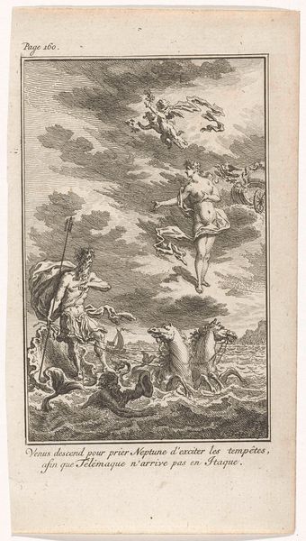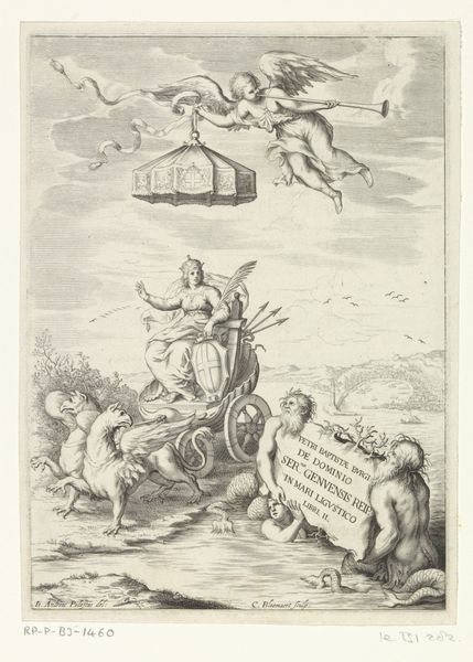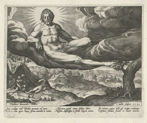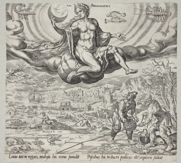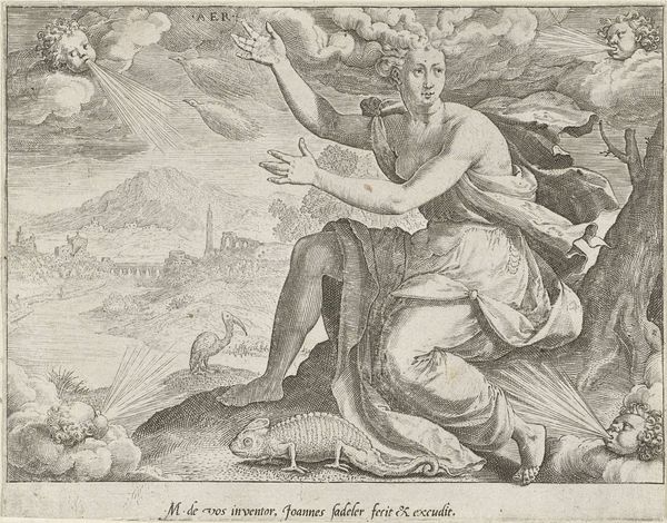 Curator: This print is titled "Virtues Interceding for the Bride," crafted in 1574 by Wierix. It is currently housed in the Rijksmuseum. The artwork, an engraving, beautifully uses line work. Editor: Whoa, talk about a Renaissance head trip! It’s like a metaphysical travel poster. Seriously, though, it's striking, ethereal almost. So many layers and that central figure looks more trapped than blessed. Curator: That is an interesting way to see it. This print isn’t necessarily trying to be straightforward; it presents an allegory, with virtues acting on behalf of the bride. Note the figure in the lower right corner labeled "Sponsa", the bride herself. Editor: Okay, I can get behind the allegory part. The floating figures up top—I’m guessing they represent virtues? Feels like they're coming out of a dream cloud—or maybe trying to break free. I find the juxtaposition with the detailed city background quite strange. Curator: Absolutely. The floating figures of course depict virtues like "Scientia" (Knowledge), Fides (Faith), and Charitas (Charity). Wierix positions them dynamically, as if intervening on behalf of the bride depicted on the terrestrial plane, rooted firmly, weighed down maybe. The composition reflects the social and religious contexts. Prints such as these would be disseminated widely. The engraving also uses an established visual language aimed to teach morals and values. Editor: Right, like a virtuous public service announcement! I dig it. But it’s also kind of subversive, in its own subtle way, isn’t it? Is the goal achieved in the composition? To me, the virtue's intervention seems incomplete—there's definitely still an uncertainty around the figure of the bride. Curator: Well, considering it's a piece intended for reflection on moral virtues and marriage, perhaps uncertainty or incompleteness inspires that reflection, challenging its viewers and inviting a reevaluation of established societal standards. Editor: It’s wild how something made centuries ago can still spark that feeling of, like, "is this all there is?" Makes you wonder what Wierix was really trying to say between all those perfectly etched lines. Curator: Exactly! And why pieces such as these still resonate today. Thank you for these musings. Editor: Thanks! Always happy to overthink some art. It keeps things interesting, you know?