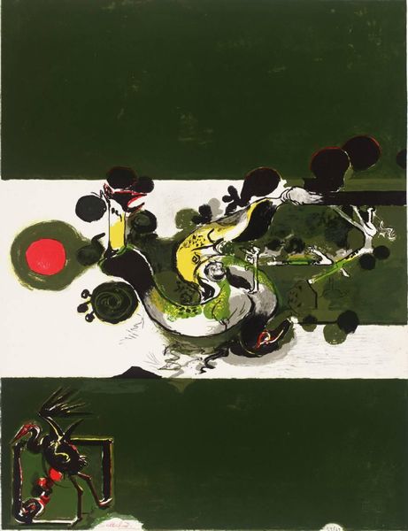 Curator: I find Martial Raysse’s 1966 mixed-media piece, "Noon Mediterranean Landscape," to be a particularly evocative articulation of its time. Editor: It’s jarring, in a way I can’t quite articulate. The rigid grid layered over soft, almost edible forms, feels like a landscape viewed through an industrial filter. Curator: Exactly! Raysse was engaging with the burgeoning consumer culture. Note the fluorescent light fixture dividing the two panels—a very modern, artificial insertion into a traditional landscape subject. The entire composition seems to ask questions about authenticity. Editor: Yes, the material choices are crucial. The layering of paint, the artificial light, the grid—are those cacti behind the wire mesh? It brings the labor and manufacturing processes to mind; perhaps it speaks to land development in the Mediterranean region and exploitation of resources. Curator: Precisely, it reflects post-war reconstruction and evolving tourist economies. This creates tension between romantic ideals and the encroaching realities of development. What identities are marginalized and what is left behind for that construction? How are those living there impacted by such growth? Editor: So you are considering that the "fence" in the work may actually represent imposed divisions caused by economics, social expectations, or policies during that era. And the natural objects contained within may be used to explore the artist's take on those affected. Curator: It encourages a dialogue between art history and contemporary theory, placing his artwork within broader intersectional narratives focusing on race, and politics. Editor: Ultimately, I see the layering and assembly of different materials speaking to the assembly line—reducing nature, culture, even experiences into products that are then consumed. The way those darker colors look when framed together speaks to issues regarding overindulgence. Curator: I see this piece is particularly impactful. By prompting engagement with themes of artifice and genuine encounters, it asks whether a true 'Mediterranean landscape' can ever exist separately from societal expectations. Editor: A powerful piece when viewed through your specific lens! Thank you!