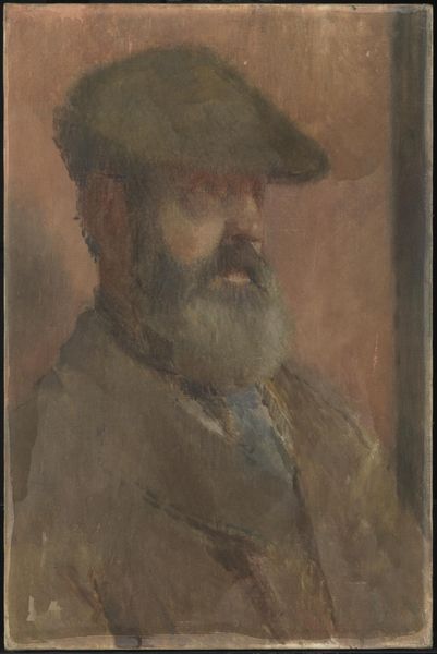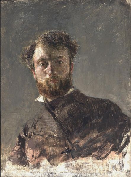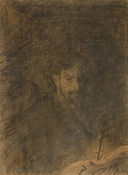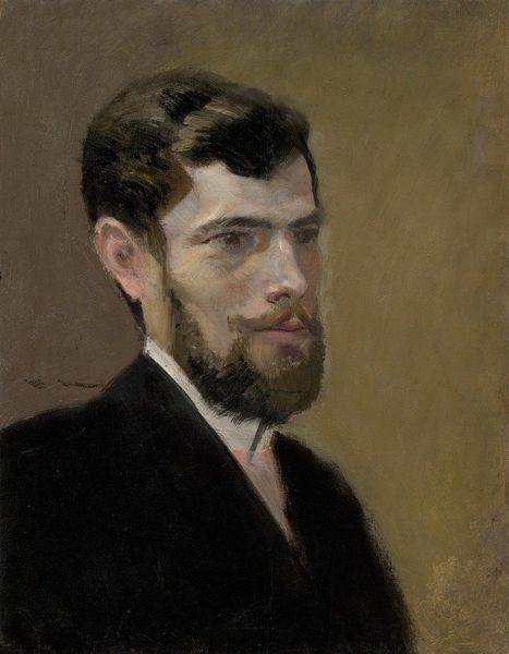 Curator: Vilhelm Hammershøi painted this study, entitled "Henry Madsen. Skitse," around 1904, utilizing oil paints. Editor: There's a somber quality, a deep shadow clinging to the subject. The restrained palette really amplifies the quiet intensity of his gaze. I immediately want to explore that tension. Curator: Absolutely. Hammershøi was a master of evoking mood through light and shadow. Given his social circles in Copenhagen, this work should also be seen in the light of an active artist community, since portraiture acted as a key role in their dynamic exchanges. Editor: In that milieu, wouldn't such a sketch signal not just likeness but belonging, a marker of a network's cultural capital? Is Madsen more than simply an individual here, embodying also certain cultural codes from that particular point in time? Curator: Precisely! Moreover, the 'sketch' designation points to a fascinating performance around the casual artistic gesture in portraiture—that feigned nonchalance speaks volumes about the status dynamics that inform the construction of Hammershøi's image, both inside and beyond the Copenhagen circles. Editor: It almost feels like an attempt to domesticate the male gaze. Hammershøi directs it not outwards, towards the viewer as subject, but rather in. To acknowledge that is particularly insightful to consider regarding how masculinity had changed as a result of cultural evolution. Curator: True. One could argue, that within this artistic exchange, Hammershøi pushes up against traditional expectations within that social milieu. It asks viewers to question what kind of identities were at play in the social theater of that era, making the act of looking both conscious and subtly charged. Editor: This intimate portrayal serves as an invitation. By creating something that does not simply embody aesthetic value, but that also incites thought through dialogue, it surpasses a simple image of likeness, acting as a point of dialogue within contemporary interpretations about image and identity. Curator: It leaves us thinking about the enduring impact that social standing had at that moment and how that shaped cultural values. Editor: It reminds us of the importance of recognizing the complex social webs that support art history and continue shaping contemporary viewpoints of identity to this day.