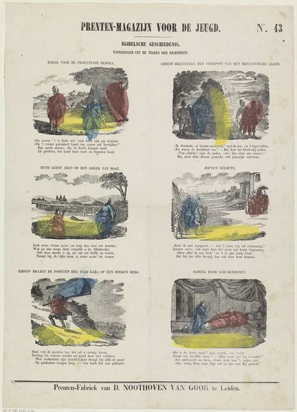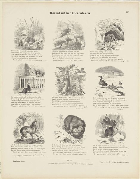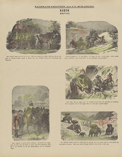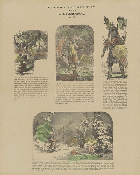 Gerhardus Philippus Zalsman created this print, "Schipbreukelingen," using an engraving technique, sometime between 1834 and 1910. The composition, arranged into four distinct vignettes, presents a visual narrative bound by a common theme, perhaps a literary or historical account. Each scene contains a balanced interplay of figures and environments, using the contrast of light and shadow to create depth and mood. The use of line is particularly striking, defining forms and conveying texture within the monochromatic palette. Zalsman's structural organization of the print employs a grid-like layout, but destabilizes this strictness through the emotive content of each panel, and the subtle variations in perspective and scale. The print uses a semiotic system where the images function as signs, pointing to broader cultural narratives of adventure, survival, and the confrontation with nature's unpredictable forces. Consider how the formal constraints of printmaking—the reliance on line and the absence of colour—serve to heighten the symbolic and emotional weight of each scene.