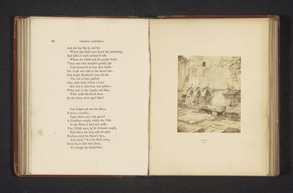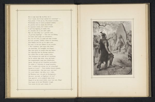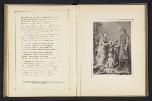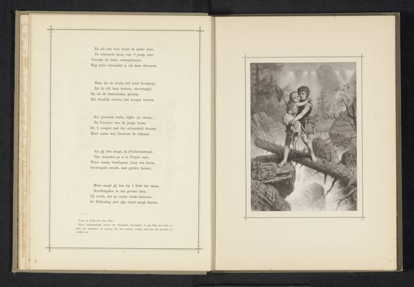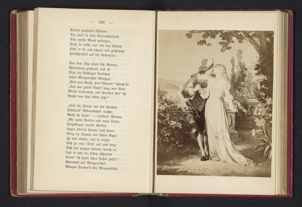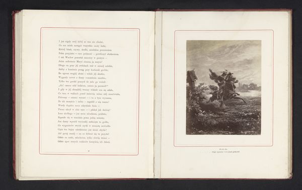Curator: What immediately strikes me is the overwhelming melancholy in this photographic reproduction. There’s something so beautifully fragile in the way the figures are rendered. Editor: Yes, Konrad Brandel created this before 1876, and we’re looking at a “Fotoreproductie van een schilderij voorstellende een ridder en een vrouw op een bospad,” which translates to “Photographic reproduction of a painting depicting a knight and a woman on a forest path." I’m curious about the original painting—what were the artistic traditions around reproduction in Poland, at that time? Was photography primarily a tool for dissemination of artworks? Curator: I imagine it certainly played a part. Think about the Romanticism permeating the scene. It's not just documentation; Brandel's manipulated the light and composition, lending it a sense of theatrical staging—the textures and tonality evoke an idealized past. Did the availability of reproduced images shape the artistic tastes and visual literacy of a growing audience? Editor: Undoubtedly. Prints, in particular, democratized images, moving artwork from elite collections into wider circulation and fostering a culture of artistic engagement beyond the traditional art world. Also, looking at the tonal contrasts created in the printmaking process here, I think it also adds another layer: The act of reproducing adds, and I want to see what's gained here besides accessibility. How does it interact with craft and artistry, considering that romanticism here idealizes some very traditional notions? Curator: Maybe that longing for an idyllic past resonates so profoundly *because* of its accessibility, wouldn't you think? Here is this incredibly polished image. Editor: That tension—between production and consumption, high art and accessible media—it reshapes both. So the means *are* very interesting. A study of access also illuminates the ways it's shaped not only the production, but, importantly, the interpretation, which helps build its enduring cultural legacy. Curator: That makes me reflect on how easily an image can be shared today, with all sorts of tools and methods. It's hard not to look for a narrative here! But thinking about what kind of emotional story this object wants to express. Editor: Ultimately, looking closely reveals these old artworks are less frozen than they first appear; their contexts shift depending on access.