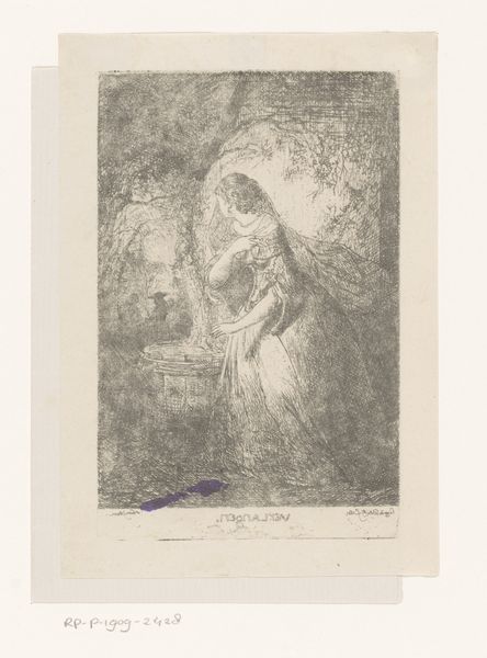 Curator: What a poignant scene rendered in etching. This work, created around 1909, is titled "Hospital Interior with a Woman Supported by a Woman with a White Cap on Her Head" by Marcel Roux. Editor: Yes, immediately struck by the desaturated tones and its heavy somber mood; its constrained atmosphere truly impacts the viewer. The composition directs our gaze to the figures while suggesting a sense of enclosure through those roughly-defined interiors. Curator: Roux's technical proficiency here is captivating. The way he manipulates the etched lines—dense and shadowed in certain areas to almost ethereal and fading in others—suggests that he clearly understood the range of symbolic power attainable from working in this medium. What significance might the contrast play between shadow and light? Editor: In viewing such a scene it makes me consider how healthcare operated and who had access to it. This would probably not have depicted an egalitarian society; the stark reality for many was one of illness without care. Was Roux using this medium and imagery to make some statements of equity and the nature of medical treatment at this period? Curator: Interesting proposal; the thematic undertones indeed resonate when juxtaposed with the societal constraints of that era. But how far might those readings shift based on what one emphasizes? Focus intently on its structural components—its spatial relationships—the human forms—or its technical elements; there resides a unified construction regardless of subject-matter which brings one to the whole art-piece itself. Editor: Your analysis certainly focuses our perception more internally. It does provoke questions on representation; by capturing this kind of quiet scene, did Roux hope it would humanize the realities hidden away in these medical environments? It speaks to me about visibility and acknowledgement, and it feels radical during a period which probably favored concealment over displays of such raw realities of living within suffering. Curator: You speak insightfully from a societal lens, while by way of formal visual dissection we might equally appreciate this etched moment in aesthetic experience removed or disconnected entirely from anything "real." A study in pure emotive composition rendered with the touch of masterful design. Editor: A potent dialogue of art historical context mingling with the art work itself, shaping a deeper encounter with both image, the process of creating it, and the societal reflection such imagery stirs from within our hearts today.