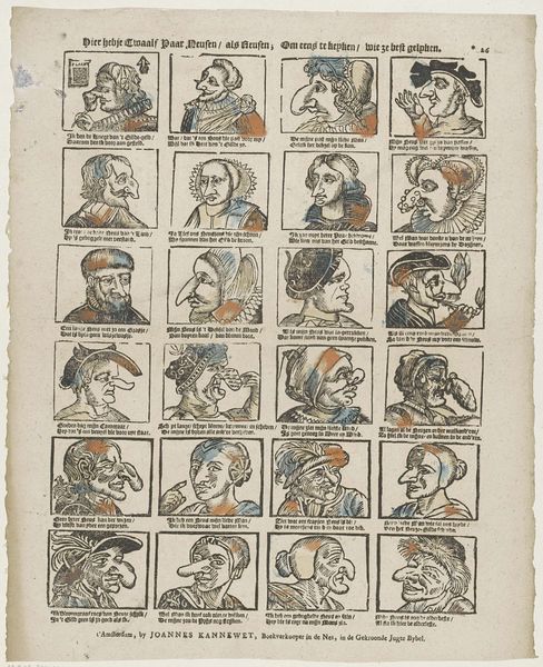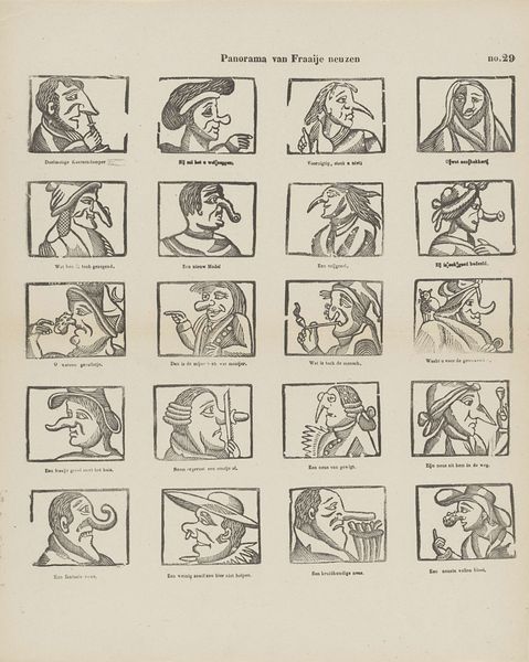 Curator: Let's discuss this rather curious engraving entitled "Kinders! wilt ge u vrolyk maaken / Met deez' raare neuzen-snaaken, / Zo beschouwt ze, en lacht dan vry / Om 't gestel, vol zotterny"—which roughly translates to "Children! if you want to make merry / With these strange nose-fellows, / So regard them, and laugh freely / At the character, full of folly." Created between 1806 and 1830, it resides here at the Rijksmuseum. Editor: Wow, my first thought is… it's so delightfully weird! Like a sheet of Victorian trading cards but for noses! Each tiny portrait is so distinct, almost aggressively unique. A little unnerving, but funny. Curator: The print provides an interesting window into early 19th-century Dutch folk art and its engagement with caricature. Note how class and gender are represented through these exaggerated features. These aren't just random noses; they're markers, signifiers of societal roles and perhaps, even critiques thereof. Editor: I like the way the artist, A. Robyn, uses the nose almost like a mask. They really distort these figures, taking liberties with human proportions. And the expressions—some seem proud, others wary. It makes you wonder what these characters would say if they could step out of their little boxes. Curator: Indeed. One might argue these depictions play into established physiognomic theories popular at the time, theories which falsely correlated facial features with inner character and social standing. It invites us to think about how humor can also be a form of social commentary, even, perhaps, reinforcing existing prejudices. Editor: Right, because you can see how these ‘humorous’ takes also echo the way satire can box people in, stereotyping based on how someone looks or acts. Makes you consider how seemingly innocent fun can be tied to wider power structures. Curator: Precisely. By examining pieces like this through the lens of cultural studies and art history, we unpack complex social attitudes. What do you take away? Editor: I think it’s made me more mindful of humor—and how much it's tied to how we view 'the other'. Like you say, how it reflects the unspoken power dynamics running beneath seemingly funny things. It also encourages one to be self aware of my own prejudices when making an artwork or judging one. Curator: Absolutely, it's an invitation to read between the lines.