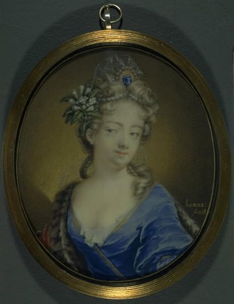Curator: Good morning. Today we’re looking at a work titled “Ung dame med blottet barm”, which translates to “Young lady with bare bosom.” Painted between 1756 and 1804, it’s attributed to Cornelius Høyer and currently resides here at the SMK. Editor: My initial reaction? An interesting composition with a slightly unsettling softness. The hazy background and almost luminous skin create a dreamlike, yet intensely present quality. Curator: The context is fascinating. During the late 18th century, artists were navigating a changing social landscape. Consider the rise of the bourgeoisie, demanding new subjects and styles. This portrait speaks, in some ways, to evolving representations of women. Editor: I agree about the representation; structurally, look at the use of light. Notice how the artist renders a palpable softness using only a focused set of shades to generate depth in an otherwise small portrait. It’s a masterful manipulation. Curator: And the implications of the bare bosom should not be overlooked; This boldness certainly invited scrutiny. One must acknowledge the politics inherent in depicting the female form in such a way, which then influenced viewers to take sides on what women represent. Editor: Yet, this is not overtly sexual, or predatory. Her gaze doesn’t invite the viewer into her private sphere. The flowers feel so deliberately innocent and delicate. Does this suggest an intentional contrast that complicates any clear reading? Curator: I believe it does. The floral garland could symbolize virtue, a carefully constructed counterpoint to the exposed chest. Ultimately, Høyer's choices present more questions than answers. Editor: In essence, this portrait offers much to decipher for a seemingly straightforward image, providing viewers a glimpse into societal norms and the subtle visual language used to express them. Curator: Absolutely. And its presence here reminds us how the museum itself is a product of its time, selectively preserving certain visions of the past. Editor: Precisely, giving artworks such as this continued power as touchstones.