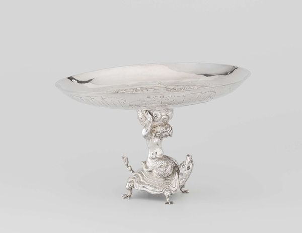 Curator: Looking at this photograph, the first word that comes to mind is 'gleaming.' Such bright, shining silver! Editor: Indeed. This is a salt cellar, created by Claes Baardt in 1689. The full title is "Salt cellar with chased fish, shells and sea creatures." It’s quite the Baroque statement piece, isn’t it? Curator: Absolutely! I’m drawn to the material. Consider the silversmith’s skill – taking a raw material and transforming it through intense labour into an object of both utility and elaborate beauty. Editor: It’s interesting how salt, a common commodity, became an indicator of status. Placement at the table was determined by your social importance relative to the salt. An item like this elevates salt into an important status symbol. Curator: Right, but it's also about process. Think of the molds, the chasing tools, the intense physical work involved. We should appreciate the silversmith's contribution to this artwork's value as much as the social connotations. I’d like to understand what Baardt was paid and under what working conditions he was able to produce it. Editor: The Dutch Golden Age, with its global trade networks and increasing wealth, really fostered these lavish displays of status. Pieces like this were highly desired, and it changed how dining took place across the social spectrum. These banquets became a new space where a family and new social class would flex their wealth. Curator: True, but it’s important to understand how global trade fuelled artistic creation. Consider where Baardt acquired the raw materials for this impressive salt cellar and at what cost! We cannot turn a blind eye to such implications of that age. Editor: It gives us so much to ponder, from Baardt’s technique, the societal norms and dynamics of that era, to how silver objects commanded power, dictating social spaces. Curator: Absolutely. Looking closer makes you appreciate not only its beauty, but also the intensive human effort, global resources, and class power put into crafting such a fascinating artefact.