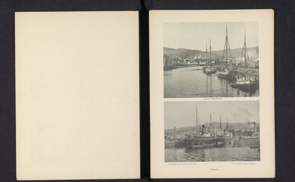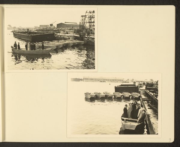 Editor: Here we have "Proefvaart," a gelatin-silver print dating back to 1953. The multiple boats create such a sense of openness and possibility, even though the monochrome flattens the perspective. How do you read this composition? Curator: Notice how the placement of the photographs within the album page affects their relationship. The top image focuses our eye on a solitary figure interacting with his vessel, the crisp tonality emphasizing the tangible textures of the boat and the rippling water. The second image diffuses the tonal range and draws back to a wider scene where individual meaning gets absorbed. Editor: So it’s about the relationships within the photographic frame as well as between the two images on the page? Curator: Precisely. Semiotically, water signifies change and movement. The boats are variations on that theme, pointing different ways, in the first anchored but the second set floating on the tide, directionless. The materiality of gelatin silver, its capacity for capturing detail, paradoxically lends a documentary feel while also being a deliberate artistic choice by the photographer, filtering and selecting specific elements to be visible within each frame. What are the recurring shapes? How do they impact your reading? Editor: Well, the boats themselves create a horizontal rhythm, yet are disrupted by the vertical presence of the figures… but the horizon is consistently straight in both pictures, right? Curator: Good eye. Even as figures seek independence and movement, the landscape's composition emphasizes order. The structure suggests constraints. Editor: I see now, there's a dialogue between freedom and control that echoes between each image and the page itself. Curator: A beautiful encapsulation, emphasizing the strength of formal readings.