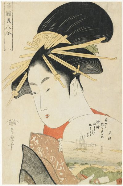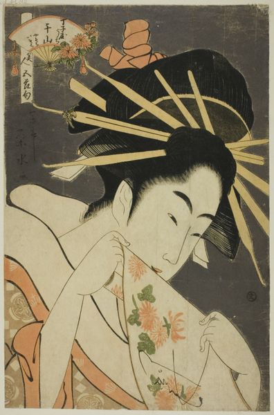 Ichirakutei Eisui created this woodblock print, "The Courtesan Hinazuru of the Chojiya" around the late 1790s. The subdued color palette and soft lines create a serene yet melancholic atmosphere, drawing us into the intimate world of the courtesan. Eisui masterfully uses line and form to convey both physical beauty and emotional depth. The delicate lines defining Hinazuru's face and the flowing curves of her kimono create a sense of graceful elegance. The composition leads our eyes to the subtle gesture of her hands holding flowering branches, a symbolic act that speaks to both the beauty and the transient nature of life. This compositional structure invites us to contemplate the tension between appearance and reality, and the ephemeral nature of beauty itself. The print functions within the visual language of its time. The delicate rendering of the subject, the flattening of space, and the emphasis on decorative pattern are not merely aesthetic choices. They reflect a deeper engagement with ideas about representation, perception, and the cultural values of Edo-period Japan. The artwork’s beauty and aesthetic value continue to be re-interpreted, offering us new perspectives on art, culture, and the complexities of human experience.