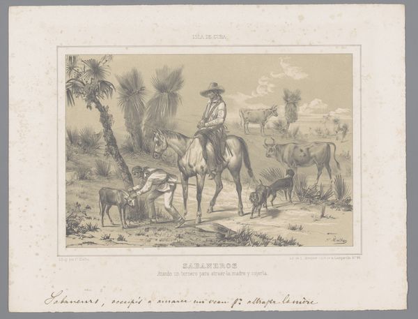 Antoine Jean Baptiste Coupé created this print, "Ruiter te paard en man met hond," around the early 19th century. The image employs a limited palette to depict a scene featuring a rider on horseback, a man, and a dog. The composition uses horizontal lines of the landscape, contrasted by vertical lines of the figures and vegetation to create a sense of depth and space. The arrangement of the figures suggests a narrative about social hierarchy and the relationship between humans and animals. The rider, elevated on the horse, dominates the scene. The standing man, positioned lower in the composition, may be read as being of lower status. The dog, set slightly apart, adds another layer to the social dynamic. Consider the artist's choice of lines and shading. These elements define the forms and textures within the print. The delicate lines and subtle tonal variations contribute to the overall mood of the artwork. It invites us to consider the stories and social contexts embedded within its visual structure.