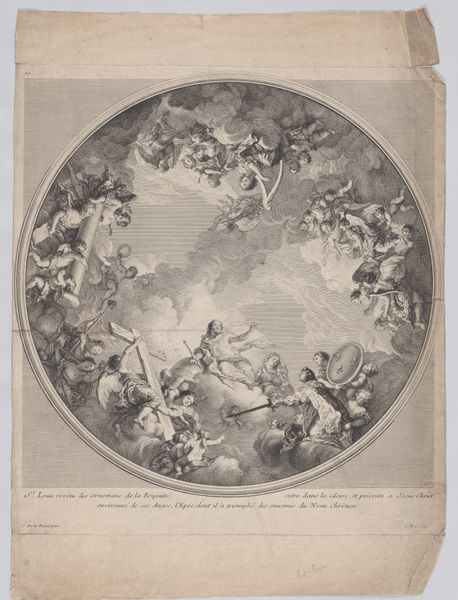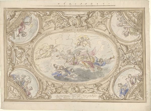 Editor: We're looking at "Ontwerp voor een plafondschildering met een allegorie met Minerva," a watercolor and ink drawing by Elias van Nijmegen, dating from somewhere between 1677 and 1755. It has a circular composition containing allegorical figures, mostly floating on clouds, surrounded by these intricate, baroque-style patterns. What strikes you first about its visual composition? Curator: The structure is fascinating. The central medallion, depicting the Minerva allegory, is formally echoed in the four corner vignettes. Note how this echoes, creates a rigorous geometric framework. The artist employs a circular format not only in the central allegory but extends it outward. The entire composition is designed to be viewed from below. How does that impact your understanding? Editor: I guess, realizing it’s for a ceiling, I’m thinking about perspective a lot more now and how the figures relate to each other in that space. But it is kind of confusing trying to understand what it’s "about" with these different characters floating around. Curator: Observe the precise deployment of line. It's less about literal representation than the effect the arrangement of lines creates. Van Nijmegen has strategically arranged figures on these various receding planes of depth, creating the illusion, which from below is amplified. What feeling do the colors and use of shading convey to you? Editor: Well, it’s delicate and subtle, so perhaps elegance, or even restraint? Given the Baroque style I would have anticipated more dynamism and intense colours. Curator: Precisely. The colour choices, in their understatement, amplify a mood of intellectual refinement that supersedes dramatic spectacle. In ignoring more typical Baroque maximalism it allows for more complex symbolic forms. What, now, do you consider to be the function of this piece? Editor: Initially I perceived just a pretty picture with no real clear idea behind it, now I realize the geometrical arrangements, and subtle tonality give it order and meaning. Curator: The function stems from the interplay between decorative intention and allegorical meaning, fused through visual construction, rendering it an interesting artifact.