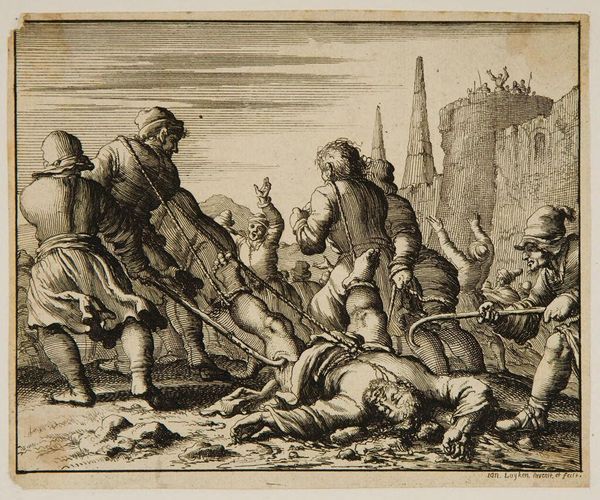 Curator: Jacques Callot's etching, "Taking of the City of Bone," presents a scene of intense military action. The size of the print is 21 by 30 centimeters, and it resides in the Harvard Art Museums. Editor: It's chaotic, isn't it? The composition feels so charged, bodies contorted, spears thrust forward. There is such dynamism. Curator: Callot's mastery lies in the meticulous detail. Notice how he renders the textures of armor and fabrics, almost palpable in their materiality. The printmaking process itself lends to the overall sense of precision and control. Editor: The print is not just about the war, it is a lens into the political and social dynamics of seventeenth-century Europe, with its ever-present conflict and shifting power structures. Who benefits from this "taking?" Curator: Ultimately, Callot transforms copper into a compelling visual record. Editor: Absolutely, and what that record tells us about power, violence, and representation should prompt deep reflection.