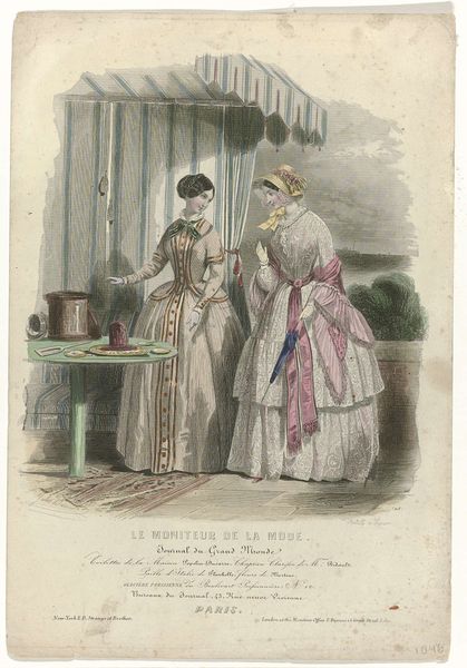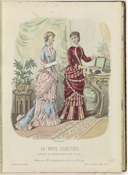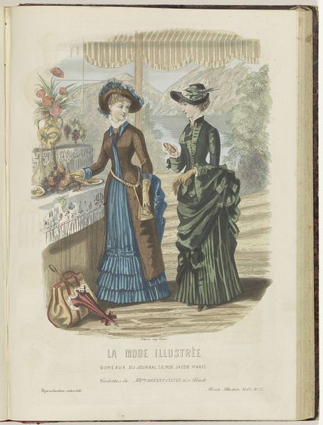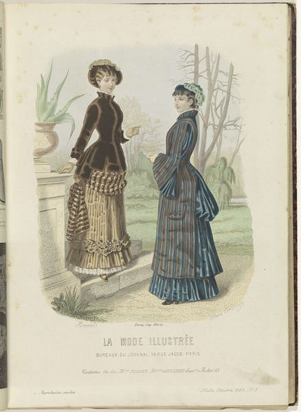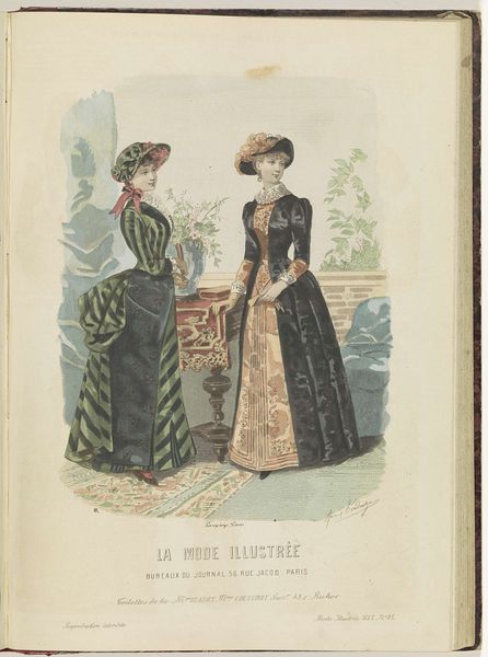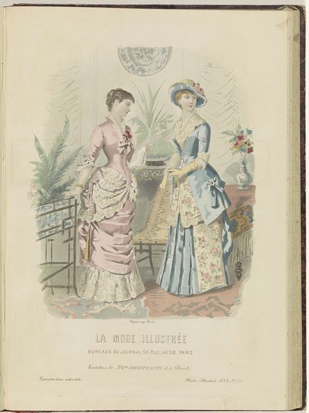 Curator: Ah, look at this print from 1882, titled “La Mode Illustrée, Journal de la Famille,” originally featured in a fashion magazine. I think the printing firm responsible for this image was Firmin-Didot & Cie. Editor: It's so gentle, isn’t it? A watercolor dream of frills and ferns, like stepping into a Jane Austen novel. A quiet conversation between two women, surrounded by delicate floral flourishes. I love the hazy romanticism of it all. Curator: Right? It's interesting to consider these fashion plates as cultural artifacts, beyond their commercial purpose. “La Mode Illustrée” wasn't just selling dresses; it was selling a vision of domesticity, of family, of women's roles in society. Editor: Totally. And it makes you wonder, what were their lives actually like? The dresses are so elaborate; were they imprisoned by them, or empowered? I get this sense of… contained energy, you know? The women are beautiful, posed, but is it artifice or authenticity? Curator: I think it's both, honestly. There's definitely an element of idealization here. Look at the subtle messages—one woman holding a book of floral studies and the other is almost flaunting her elegance. There's an artful display of status through clothing and composure. Editor: It’s almost like performance. Fashion as theater. Each carefully chosen accessory speaks to a carefully crafted identity. Even the colors, the muted greens and blues, evoke this feeling of restrained emotion, like holding a secret close to your heart. Curator: I think the print hints at how the public consumed fashion media, particularly how women may have interacted with the images in the journals for self-representation. In fact, the Rijksmuseum, where this print currently resides, highlights the magazine's broad distribution, especially to the affluent, reflecting a specific societal gaze that shapes beauty standards of that time. Editor: Gazing back at the gaze now, eh? This image definitely offers plenty of entry points to reflect about constructed realities, beauty, power, and self. Thanks for sharing. Curator: Thanks. These small prints remind us of fashion’s capacity to function as both documentation and fantasy.