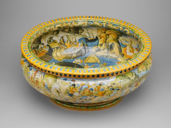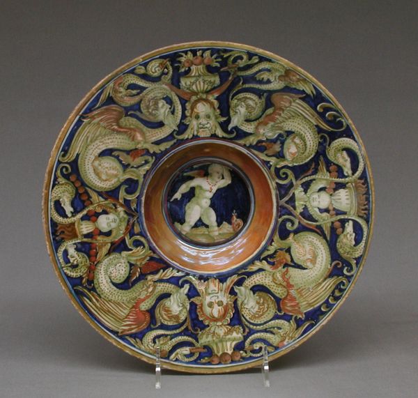 This is a Fecundity dish of unknown date, made by an anonymous artist. The dish presents us with a classical scene rendered in vibrant color. At its heart is a reclining nude female figure, surrounded by playful putti, symbols of love and abundance harkening back to ancient Roman art. The image's true power lies in its connection to primordial ideas of fertility, an age-old motif stretching back through time. Consider the Venus of Willendorf, her exaggerated form embodying the life-giving force. Here, the artist updates this eternal image, placing it within a courtly, Renaissance context. The putti, derived from Cupid and Eros, are a visual echo, a reminder of desire and the generative impulse. Their presence invokes the past, reminding us of the cyclical nature of life and the persistence of certain images in our collective psyche, a testament to the enduring power of symbols to evoke profound emotional responses.