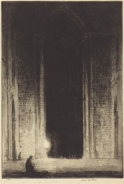 Odilon Redon created this lithograph, titled "I saw a flash of light, large and pale," using stark contrasts and textural variety to explore the depths of perception and the unseen. The composition is divided starkly; one side is lit, revealing wood-paneled walls and a tiled floor, while the other plunges into an almost impenetrable darkness, where only the vague form of a staircase can be discerned. This stark juxtaposition creates a visual tension, drawing you into a space that is both familiar and deeply unsettling. Redon masterfully uses lithography to create subtle tonal gradations, evoking a sense of mystery. Redon's image destabilizes conventional notions of space and perspective, reflecting broader artistic and philosophical concerns, moving beyond surface appearances to explore the realm of dreams and subconscious experience. The contrast between light and shadow challenges the idea of a stable, knowable reality. Redon invites us to consider how our perception shapes our understanding of the world, suggesting that what we see is but a fraction of what exists.