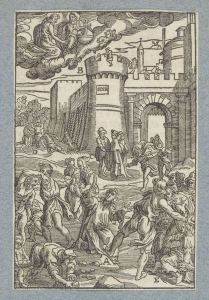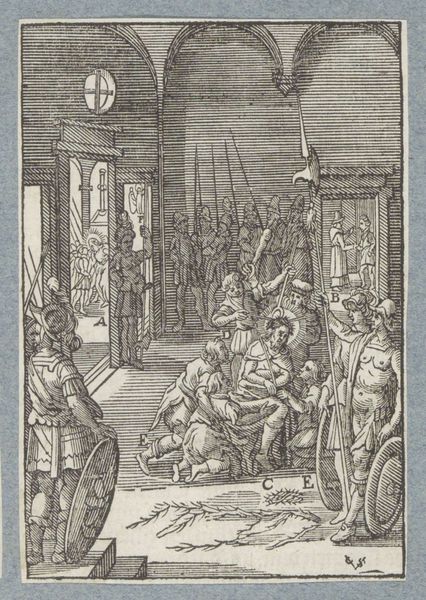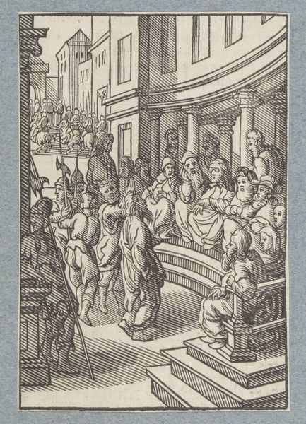 Curator: Here at the Rijksmuseum, we have before us, "Joseph's Brothers Kneeling Before Him in Egypt," created by Christoffel van Sichem II, sometime between 1645 and 1646. It's an engraving, a print, really packed with figures. Editor: It's... dense. The composition feels incredibly compressed, doesn't it? All those figures pushing forward, the rigid architecture behind. The emotion seems almost… suffocating. Curator: Baroque printmaking often served didactic purposes. These images, disseminated widely, reinforced biblical narratives within the socio-political framework of the time. Van Sichem’s rendering brings Joseph’s story to a broader audience. Editor: The stark contrasts emphasize the drama—almost theatrical. See how the kneeling figures in the foreground are brightly lit while the city behind appears as an ominous backdrop. And those receding columns; such rigid verticals establishing the scene. Curator: It invites reflection on power dynamics, familial reconciliation, and, arguably, colonial administration—given that Joseph holds a position of power in a foreign land. The checkerboard floor becomes significant in this discussion, highlighting concepts of order. Editor: Right, the composition echoes other formal artistic elements of its period like paintings on biblical stories, such as similar use of chiaroscuro, a technique which exaggerates the dramatic effects. Even though there are other individuals around Joseph, he still is rendered with his own illuminated space which emphasizes his superiority. Curator: Consider also that the Baroque period favored this kind of intense emotionalism to move the faithful. This print, by disseminating the image so widely, contributed to that end, reminding the everyday believer of God’s promise and mercy through this domestic retelling of the events. Editor: Overall, it's clear the artist wants to tell you something, right here, right now. There is such narrative clarity in all the linear detailing of people’s emotions! Curator: Precisely. It reveals much about how religious and moral narratives were visualized and disseminated in the 17th century, through what, to our eyes, looks incredibly modern! Editor: Ultimately it displays the effectiveness of design to support the storytelling behind visuality.