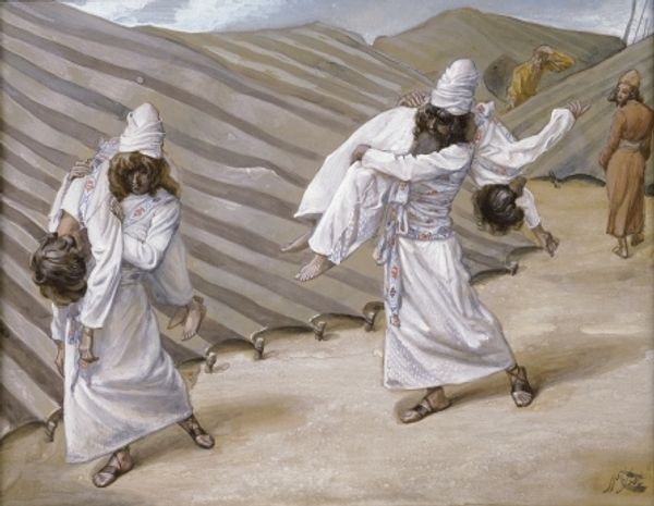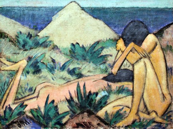 Curator: It evokes a profound stillness, doesn’t it? Like time holding its breath. Editor: Indeed. This is Nicholas Roerich’s "Signs of Christ," painted in 1924. It’s an oil painting, currently housed at the Roerich Museum in Moscow. Notice how Roerich merges landscape and figuration to create something almost otherworldly. Curator: The landscape is almost sculptural in its rendering. Look at those textured, layered surfaces - I’m immediately thinking about the materials themselves: the layering of the paint, the physical act of applying it to create these forms. Did he use palette knives? There's a real materiality that translates through the image, speaking to a dedicated working process, where labor becomes almost meditative. Editor: The layering definitely gives a sense of depth, drawing us in. But, Roerich’s work here, part of the Russian Avant-Garde movement, goes beyond materiality; it’s charged with symbolism, particularly the connection between earthly spaces and spiritual concepts. The imagery serves a deliberate public role in constructing meaning around Christ and related histories. What’s that inscription? Curator: It looks etched into the surface, doesn't it? Almost primitive. Like something excavated rather than created ex nihilo. In relation, note those figures rendered almost in silhouette – a woman, perhaps, being watched by a man standing just behind her in traditional Middle Eastern garb. How was that clothing produced? Were the figures made to feel dehumanized? Are they truly of this earth or imagined beings placed there by the laboring hand? Editor: Precisely. That is what is truly fascinating: they give such reverence but against this larger spiritual backdrop; that image is then being projected back on 1920’s Russia through exhibitions, prints and so forth and consumed. Roerich, remember, was deeply involved in the spiritual and esoteric, using his art as a vehicle for universal themes. And to connect all this work with manual artistic labor of making – fascinating. Curator: Absolutely, his emphasis on the making brings into consideration the role that artmaking itself plays, connecting both high art and simple craft by means of labor itself. What better expression of that effort and meaning than "Signs of Christ" itself? Editor: It certainly offers food for thought regarding faith, imagery, and the hands that shape our understanding.
