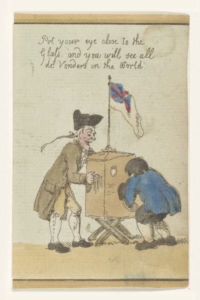 Editor: Here we have "Man met een kijkkast" from 1793-1799, made with etching and colored pencil. It strikes me as odd – the figures are so exaggerated and cartoonish, it’s unsettling, yet playful. What do you make of the piece? Curator: Note the carefully constructed composition: The two figures, balanced on either side of the box, are masterfully positioned. Observe how the lines of their bodies – their noses, the curves of their stances – are mirrored and exaggerated to amplify the caricature. Do you see any internal rhyming here? Editor: Well, I noticed the repetition in their noses and how they lean forward similarly. But the 'internal rhyming', can you elaborate? Curator: Certainly. Consider the tension between the crisp, precise lines defining the figures, and the softer, blended hues of the coloured pencil washes. There is a deliberate discord that contributes to the overall sense of unease, a formal device which underpins and intensifies the work’s satirical nature. Editor: That makes sense, the contrast really heightens the comedic effect. And yet, it also contributes to that underlying sense of something not quite right. It is a perfect tension. Curator: Precisely. The beauty, or perhaps I should say the genius, of this piece lies in how these formal elements create layers of meaning. This engraver harnessed visual language to challenge societal norms. And that remains powerful today. Editor: That's fascinating. I hadn't considered how deeply the composition contributes to the message. I see the satirical quality much more clearly now. Curator: Yes, examining the formal devices unlocks layers of intention. The artist’s skillful manipulations guide our reading of the image.