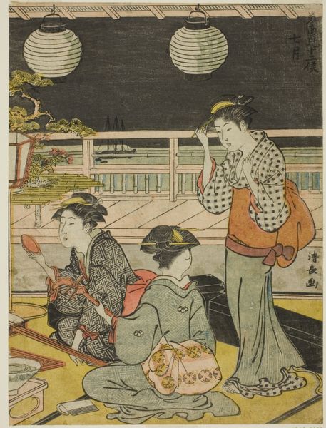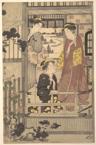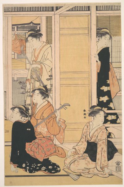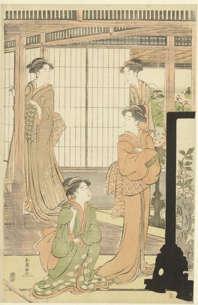Curator: The work we're looking at is a color woodblock print by Torii Kiyonaga, titled "Parody of Princess Joruri and Ushiwakamaru" from around 1788. It’s part of the Ukiyo-e tradition. Editor: Ukiyo-e...ah, pictures of the floating world! It has a light and dreamlike feel to me, like glimpsing a moment through a veil. The palette is subdued but very pleasing. Curator: Yes, Kiyonaga was a master of depicting contemporary life in Edo period Japan, with a focus on elegant figures, often in domestic settings. He also ran one of the most prominent printmaking studios of the era. The subject matter is what makes it really special. Editor: Right. A "parody." So, are these elegant ladies essentially playing dress-up, re-enacting this famous legend? Curator: Precisely! Princess Joruri and the young hero Ushiwakamaru are figures from Japanese folklore, often romanticized. What Kiyonaga does here is insert these figures into a very contemporary, perhaps even commonplace, scene. This subverts high and low art forms in an amusing way. The legend gets a little tongue-in-cheek nudge. Editor: I can almost feel a quiet wink from the artist, like he’s inviting us to see the humor in our own daily dramas, inflated as they can be. The figures are so gracefully arranged within the frame, the space itself a kind of character too with its open architecture. Curator: Ukiyo-e prints played a significant social role. They were popular among the burgeoning middle class, functioning as fashion magazines, theatre bills, celebrity endorsements… It was really popular culture at its finest. Editor: So true. I'm sensing a longing for a past that maybe never truly existed. A beautiful, but perhaps simplified vision. Curator: Indeed. I think what this parody does best is highlight both our nostalgia for idealized tales and our recognition of the messy, beautiful, and ordinary realities that actually make up our lives. Editor: Absolutely. It invites me to let go of the pressure for grand narratives, find the romance in the mundane, and smile a little more. Curator: A wonderful observation. Thank you. Editor: Likewise.