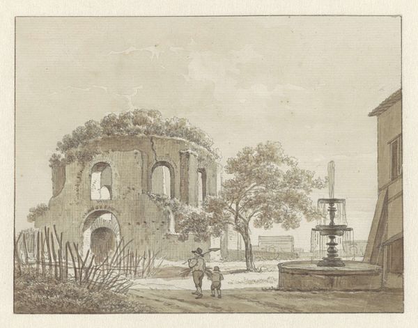 Editor: This drawing, “De Muiderpoort, Amsterdam” by Reinier Vinkeles, dated 1768, captures a serene cityscape in ink on paper. I’m struck by the emphasis on the gate as a passageway between nature and the city's rigid architecture. What do you make of it? Curator: I see the careful application of ink washes less as a picturesque scene and more as a record of material realities. Notice how the very process of creating the image becomes visible. Vinkeles isn't just depicting the Muiderpoort; he's presenting the paper, the ink, the tools that transform raw materials into representation. What can we discern about the labour involved? Editor: Well, you can see the different strokes used to depict different textures…the meticulous rendering of the bricks versus the feathery lightness of the trees. It suggests a careful, skilled hand, not mass production. Does the choice of materials, ink and paper, reflect the period's social context? Curator: Precisely. Ink, though relatively inexpensive compared to oils, still needed processing, trade, and skill to manufacture. Paper, too, was becoming more accessible, facilitating the spread of information and, indeed, artistic expression, across wider social strata. Is Vinkeles challenging or upholding class divisions here through his artistic practice and distribution? Editor: It's fascinating to consider the artwork in that light. I was initially drawn to its aesthetic appeal, but thinking about the labour and materials involved offers a completely different lens. Thank you! Curator: Indeed. By tracing the journey of these materials, we begin to unpack not only the artist's intention but the wider economic and social forces at play in 18th-century Amsterdam.