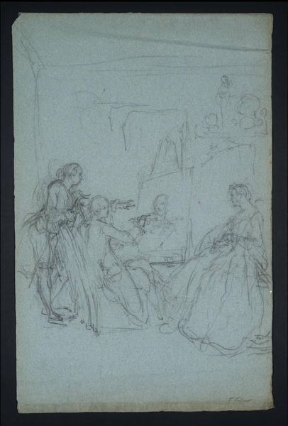 Curator: This is William Valentine Schevill's "Sketch of a Standing Man and a Seated Woman," currently residing at the Harvard Art Museums. Editor: There's a quiet tension, almost secretive, conveyed through those faint pencil lines. It feels like we are intruding on a private moment. Curator: Indeed, Schevill's sketch shows us a glimpse into what feels like a casual interior scene, rendered with a delicate touch that speaks to the intimacy of domestic life. The figures appear contained. Editor: And it's interesting, isn't it, how the grid behind them, presumably for scaling up the composition, is still visible? It reminds us of the labor of the artist, the process, the construction of a narrative. Curator: Precisely! Those visible construction lines offer a raw glimpse into Schevill’s methodology. The grid almost traps the individuals within it. Editor: In the end, it's this very incompleteness that makes this work so compelling for me—a study in captured moments. Curator: Agreed. It feels like a privileged peek behind the curtain of artistic creation, and the human drama in everyday life.