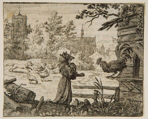 Editor: So, this is "Reynard Peers Down the Well" by Allart van Everdingen. It's an etching, and it feels incredibly whimsical but also a little menacing. What story do you think it's telling? Curator: Ah, Reynard the Fox! A trickster. The well becomes a mirror reflecting our own cunning, doesn’t it? Look at the details—the meticulously etched lines creating depth, the knowing look of Reynard. He's a character, isn't he? Editor: He is! But is it just about the fox? Curator: The beauty of Everdingen is that it's never just one thing, is it? It's about nature, fable, and the theater of life, all swirling together. The well, the fox, the viewer – we are all peering into the unknown. Editor: I never thought about it that way. It’s like a visual puzzle. Curator: Exactly! A puzzle with a sly grin. It makes you wonder what other stories lie hidden beneath the surface.