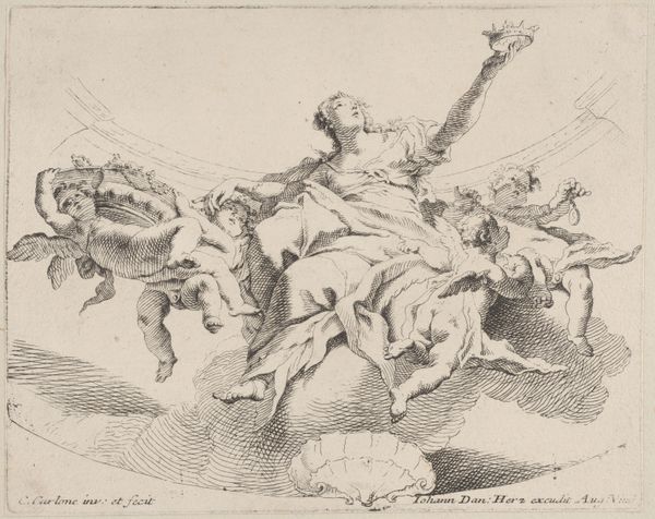 Michel Dorigny created this print, Allegory of the Peace between France and England, using etching techniques. The composition is divided into distinct registers. Heavily clouded, the lower register is where human figures recline. Above them, figures sit upright on the clouds, creating a sense of elevation. These are arranged in loose symmetry with winged figures at the top corners looking inward and downward. This draws our eye into the scene, generating feelings of both harmony and ascension. Dorigny uses light and shadow to define forms and create depth. The contrast between the dark clouds and the brighter figures enhances the scene’s dynamism. This play suggests the instability of earthly matters versus the clarity of heavenly peace. The structure, in its symmetry and upward movement, visually reinforces the concept of peace as a state of elevated equilibrium.