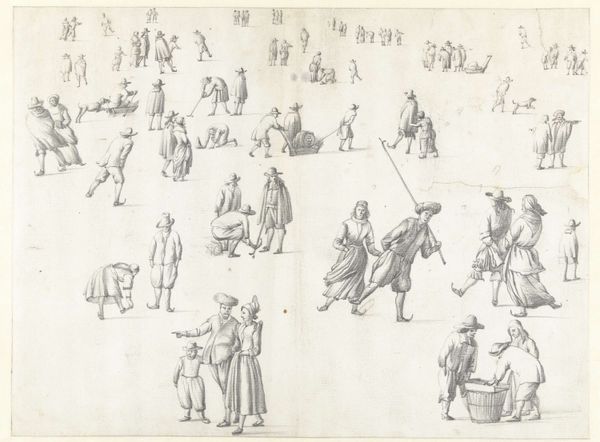 Curator: What a lively sketch. Francesco Guardi’s "Studies of Walking Figures" is full of movement, though somewhat sparse on detail. It's interesting how he captured the essence of a crowd simply with a few deftly placed lines. Editor: I immediately notice how ethereal and almost dreamlike the figures seem. The sepia ink against the faded paper lends an air of antiquity, as if we're glimpsing ghosts from Venice's past. Are there particular symbols here? Curator: It's likely that Guardi completed the study sometime between 1712 and 1793. At the time, the Rococo style influenced not just paintings, but social and political norms as well, and it seems significant that everyone depicted seems occupied with navigating the physical and social spaces in front of them, hinting perhaps at a lack of intersectional or community engagement. Editor: Fascinating. Looking closer, the clothing hints at social status – perhaps some merchants, nobles…and it's clear their placement, too, suggests hierarchies within the city. I see rhythm, repeated motifs of hats, cloaks, that suggest the daily rituals, and the masked revelries of Venice. I find myself focusing on the symbolism of masks. What might their ubiquity have signaled in this moment? Curator: Absolutely, that sense of masquerade—or anonymity in plain sight. Given Guardi's historical position, the potential symbolism of the cloaks seems unavoidable. Considering this, are we to read these “studies” as observations, or critique of Venetian social life? How did they represent a society increasingly stratified and struggling under aristocratic power? Editor: Perhaps both observation and quiet critique? After all, art holds up a mirror. It's as though each figure’s purposeful motion indicates personal ambition, which, as we see depicted here, is at times in tension with collective prosperity. Curator: Ultimately, the “studies” become more than mere figure drawings. It provides commentary on 18th-century Venice—a microcosm of its power dynamics, visible through the relationships in urban space. Editor: A world of suggestion, so much more compelling than exact details. Guardi has left the rest for us to imagine.