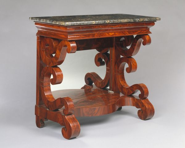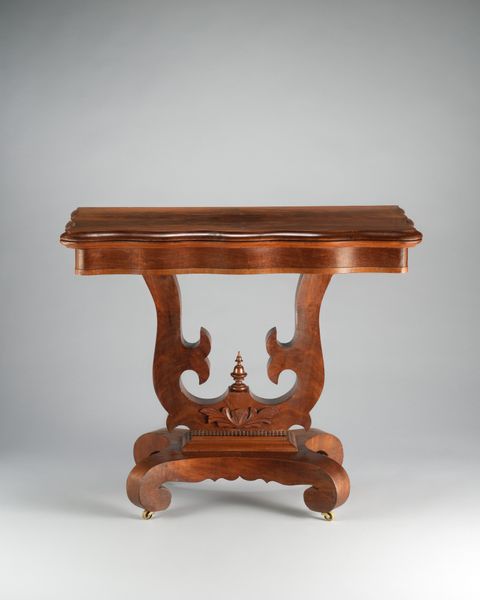 Editor: So, this is Charles-Honoré Lannuier’s "Card Table," circa 1815, crafted from wood and carving. I'm immediately struck by its rather theatrical form, almost like a stage for a miniature drama. How do you interpret its structure? Curator: The object’s structure speaks volumes. Note the stark contrast between the flat, unadorned plane of the tabletop and the elaborate sculptural base. This dichotomy serves as a visual tension, wouldn't you agree? The linear top is visually suspended by a complex system of figural supports and animalistic feet. Editor: Yes, I see that! It’s almost as though two separate aesthetic sensibilities are clashing, or perhaps, complementing each other. What's the effect of using of different colors? Curator: Observe how the use of contrasting materials--dark wood against gilded elements--furthers the dramatic tension. It fragments our attention. Our eye is never allowed to rest, perpetually moving between the simple geometric shapes and the ornamental excesses of the base. And the symmetry...is it perfectly symmetrical? Editor: I think so! So you are saying that the way the forms play out and interact in this table, the contrast of material, texture and the symmetry are the elements which constitute most of its significance. Do you find the lack of ornamentation in the table to suggest functionality or create more tension? Curator: Its visual severity only amplifies the ornamentation. We observe how one zone affects another. Considering these design choices provides greater appreciation of its aesthetic intention. Editor: That’s a fascinating point. I had not considered the visual severity of the top in conversation with the ornamental excesses of the base before. Thanks! Curator: Precisely! I'm pleased we could reveal some the forms relationship today.