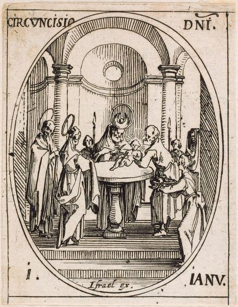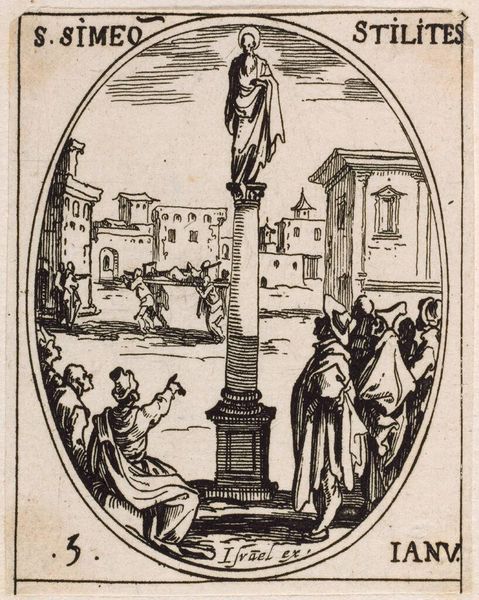 Curator: This is Jacques Callot’s "Saint Titus," a small engraving measuring just 7.6 by 4.9 centimeters, now residing at the Harvard Art Museums. Editor: Wow, even at that scale, it feels monumental. The graphic nature of the lines, the stark black and white—it’s got real presence. Almost theatrical. Curator: Callot was a master of etching and engraving, influencing many artists with his technical skill and dramatic compositions. Editor: The figures have such a unique expression, almost cartoonish—not in a bad way. Is that the Bishop giving a sermon? The people in the crowd are really captivated. Curator: Yes, the print likely served a devotional purpose. Saint Titus was an early Christian figure, a companion of Paul the Apostle. Callot's work often navigates the sacred and the profane, revealing much about the role of the church at the time. Editor: You know, it's easy to forget how much impact prints like these must have had. It's a bit like a sixteenth-century meme! Curator: Exactly! These works helped spread ideas. It gives us a peek into the ways people received and engaged with religion. Editor: It’s amazing how something so small can hold so much history, and even a little humor, honestly. Curator: It’s a reminder that art isn’t always about grand gestures. Even the smallest piece can illuminate a world.
