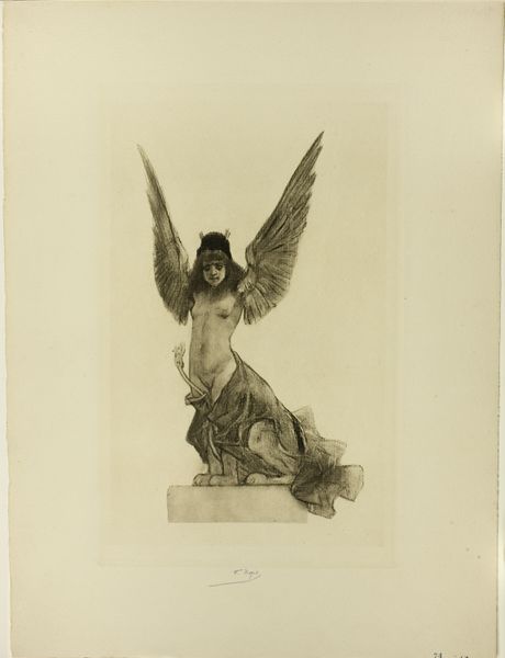 Curator: Immediately, I'm struck by a sense of ethereal lightness; she seems to float. Editor: What we have here is an albumen print dating to around 1890, titled "M. Robinson, from the Actresses series (N245)," produced by the Kinney Brothers Tobacco Company as a promotional card for Sweet Caporal Cigarettes. Curator: So, this captivating image of M. Robinson, who I presume was an actress of some note, was used to sell cigarettes. It speaks volumes about the commodification of female performers in that era, and their representation in the public sphere. How interesting that the impressionistic style mimics the freedom that was starting to peek through the rigidity of Victorian society, yet she is ultimately used to advance corporate profit. Editor: Note the theatricality of the pose. Her raised arms and flowing gown evoke a sense of grace and aspiration; indeed she resembles an angel, wings spread wide. But there is something else at play. Look closer and you can appreciate how this single image carries with it connotations of hope, innocence, and ascension. Curator: Exactly, and perhaps more insidious, the link between female beauty and a harmful addiction was normalized, contributing to an entire cultural understanding of womanhood. This portrait encapsulates tensions between celebrity culture, patriarchal structures, and burgeoning consumerism in America during the late 19th century. The power dynamic embedded in this seemingly harmless photograph reveals much about the limited agency afforded women in that period. Editor: And the success of Kinney Brothers' product no doubt cemented certain perceptions; did smoking liberate or bind women, the image implicitly asks. I'm drawn to how her facial expression conveys a longing, as though she were a spiritual muse; the cultural memory of female iconography extends far beyond the scope of advertisements and popular consumerism. Curator: That reading allows space for M. Robinson, as an individual, who inhabited that particular moment. As we have explored, it's vital to keep in mind how representations perpetuate certain social norms but are also sites of contestation and individual expression. Editor: Indeed, let us continue to challenge conventional readings while reflecting upon this fascinating piece of cultural history.
