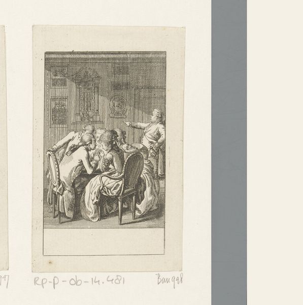 Curator: Here we have Daniel Nikolaus Chodowiecki's "Filips II ontvangt de sleutels van Jeruzalem," an engraving from 1781, found here at the Rijksmuseum. What are your initial thoughts on this particular work? Editor: Well, it strikes me as surprisingly understated. I mean, it’s the keys to Jerusalem! Shouldn't there be…more? A grander stage, perhaps, more overt drama? Curator: It's true, there’s a subtle energy. It is fascinating to think of how this scene, rendered in delicate lines, draws upon the potent symbolism inherent in the transfer of keys, suggesting control, authority, and a lineage stretching back through history. Editor: I'm captivated by that hand holding the tray, slightly shaking, with keys to power and potential bloodshed! What sort of tale is that? I wonder if the artist intended to portray Filips II as bored by this submission? It adds such an unexpectedly nuanced layer to what could have been a purely triumphal image. Curator: I see your point! The keys themselves are ancient symbols of access, of secrets revealed and authority gained. By placing Filips II so passively within the frame, Chodowiecki might subtly critique the notion of absolute power, perhaps highlighting the burdens and moral complexities of leadership, as the Dutch remember his leadership and authority with bitterness. Editor: Exactly! It subverts the typical power dynamic expected in a historical painting, nudging the viewer to reconsider what victory truly entails. You've nailed the historical interpretation there. Is this apathy or perhaps simple fatigue? It also reminds me of how powerful leaders are, in the end, as flawed as the common man or woman, after all. Curator: An interesting contrast! And while the scene depicts a specific historical moment, its themes—power, duty, and surrender—continue to resonate across centuries. Even rendered in a monochrome print, its ideas possess real depth, allowing the viewers to experience events alongside Filips. Editor: It makes me wonder about all the unseen dramas behind those seemingly simple moments. What unspoken agreements and bitter pills were swallowed by those bearing the keys? The engraving does this great job of making you think. Curator: Indeed. It provides the viewer so many different, distinct vantage points to explore! Thank you for that thoughtful reading. Editor: The pleasure was all mine, truly! It is remarkable to encounter those little sparks of creative rebellion within the constraints of traditional forms.