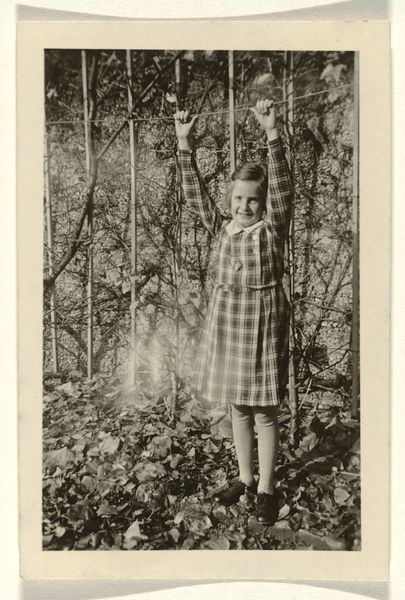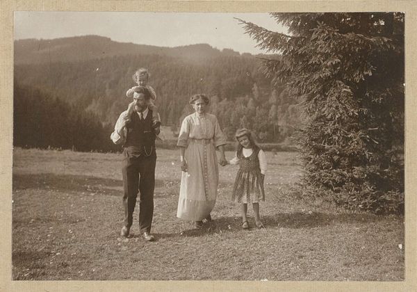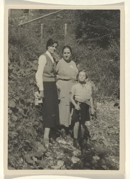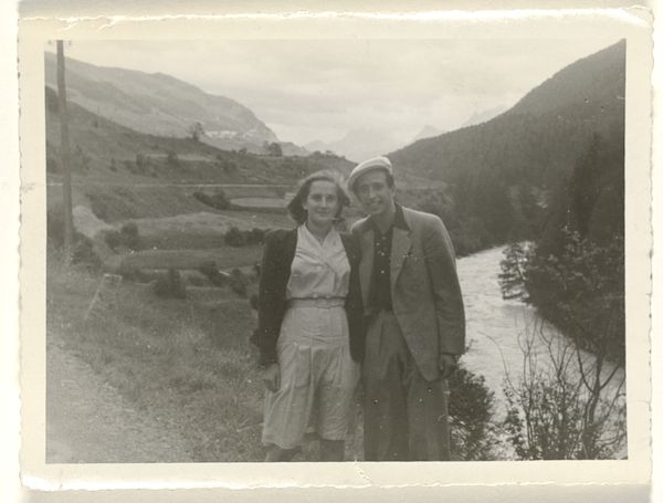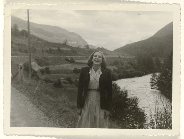 This black and white photograph captures Isabel Wachenheimer with her apron and dress on a mountain path near Trübsee, it was taken in August 1935 by an anonymous artist. The image is dominated by shades of gray, from the light sky to the dark mountain range that looms behind Isabel. There’s an incredible contrast between the details of Isabel, her floral dress and white apron, and the soft textures of the mountainous landscape. I’m drawn to the way the photographer uses light to create depth, guiding our eye from the foreground to the distant peaks. There’s something haunting about the blank stare of the camera, like the photographer wanted to capture this moment, this person, in time. It reminds me of the work of photographers like Alfred Stieglitz, who sought to capture the emotional weight of everyday scenes. Ultimately, this photograph invites us to consider the stories behind the images we encounter, the lives and experiences that shape our understanding of the world.