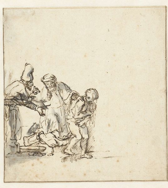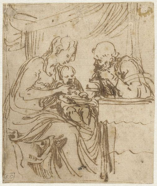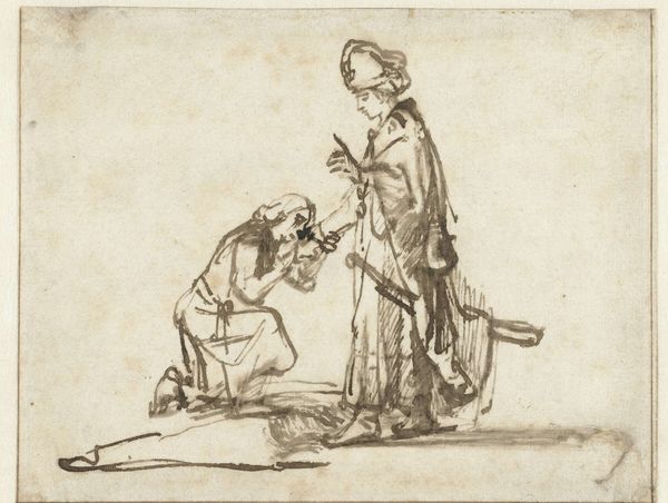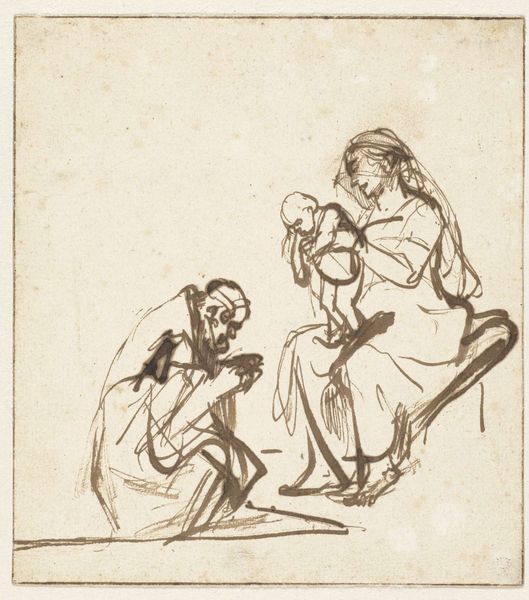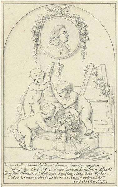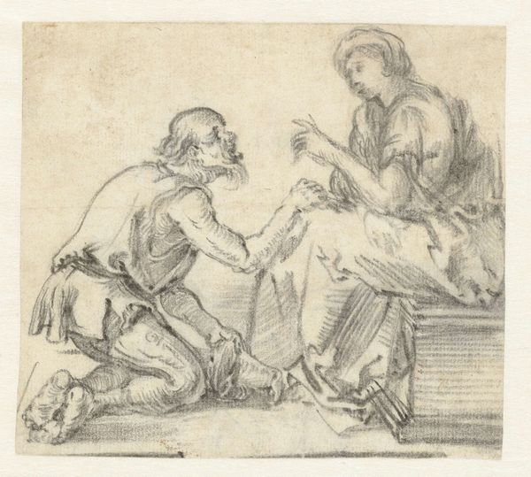Johan Antoni Kauclitz Colizzi created this delicate etching titled "Vrouw met kind in loopwagen." It depicts a woman interacting with a child in a walker. Notice how the composition is structured around the contrast between the angular, mechanical form of the walker and the soft, organic shapes of the figures. Colizzi uses a network of fine lines to delineate form and texture, creating a sense of depth and animation. The density of the lines varies, suggesting shadow and volume, particularly in the woman's face and clothing. The etching medium lends itself well to the depiction of intricate details. Consider the way the artist captures the texture of the fabric and the subtle expressions on the faces. These elements invite us to consider the relationship between the figures and the broader social context of childcare in the 18th century. Colizzi uses formal elements to engage with broader ideas about family and human development. The artwork doesn't offer a singular meaning, instead, it encourages ongoing dialogue.