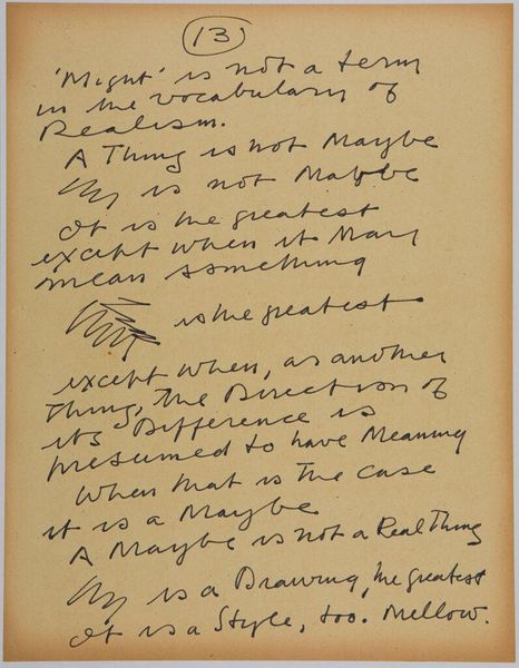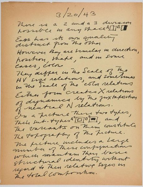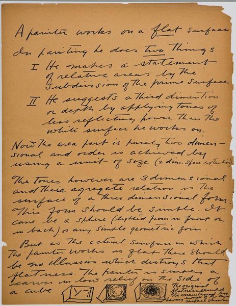 Curator: This is "Art Theory Text with Sketches" by Stuart Davis. It offers a glimpse into his thinking about artmaking. Editor: It feels like looking at someone's raw thoughts. The handwritten text has this immediate quality, almost like a stream of consciousness. Curator: Absolutely, and consider the materials: paper and ink. Davis's choice to jot down these ideas implies a directness, a lack of pretension. Editor: Right, no fancy canvas or oils here. Just a working document. And those little sketches—are they symbolic or just doodles? Curator: I think they are a visual complement to the ideas he's exploring in words. Symbols of the perceptual, maybe even the subconscious—a sort of shorthand for concepts. Editor: Fascinating how he marries language and simple form to wrestle with something as complex as perception and logic. It makes me reconsider the traditional hierarchy between theory and practice. Curator: Indeed. Seeing it as a material object, a site of labor, adds another layer to our understanding of Davis's artistic process and his intellectual pursuits. Editor: It's a really insightful reminder that ideas, just like paintings, are made, constructed, and come from somewhere concrete.