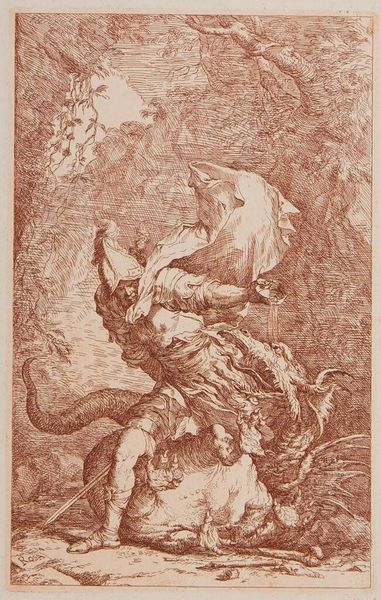 Editor: This drawing, "Jacob Wrestling with the Angel," likely made with ink on paper around 1700, strikes me as incredibly dynamic. The figures seem locked in a struggle, and the light creates such drama. How do you interpret this work, considering its historical context? Curator: What stands out to me is how this image captures the intense intersection between the personal and the divine, a common theme in the Baroque period but also something that continues to resonate today. The struggle isn't just physical; it’s a metaphor for wrestling with belief, with identity. Consider the story itself: Jacob, on the precipice of a difficult encounter with his brother, wrestles with a mysterious figure. Editor: So, you're seeing this piece as more than just a depiction of a biblical scene? Curator: Precisely. It's a visual representation of inner turmoil, a physical manifestation of spiritual conflict. Think about what Jacob ultimately gains: a new name, a changed identity. How does this wrestle connect to your understanding of how people redefine themselves in relation to social or historical conflicts? Editor: That's fascinating. I never thought about it in terms of identity transformation and social conflicts, I only saw it as a religious motif! Seeing the piece now I think about the moments in life that test us and reshape us. I wonder what "angel" represents in modern, secular terms? Curator: That’s precisely the type of question we should be asking. It is that question, "What are our angels?" That make old pieces resonate so vividly today. Editor: Absolutely, I’ve gained a completely new appreciation for this drawing today! Thanks!