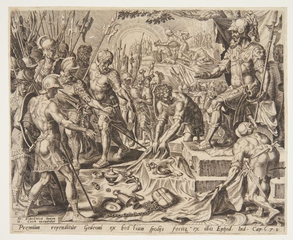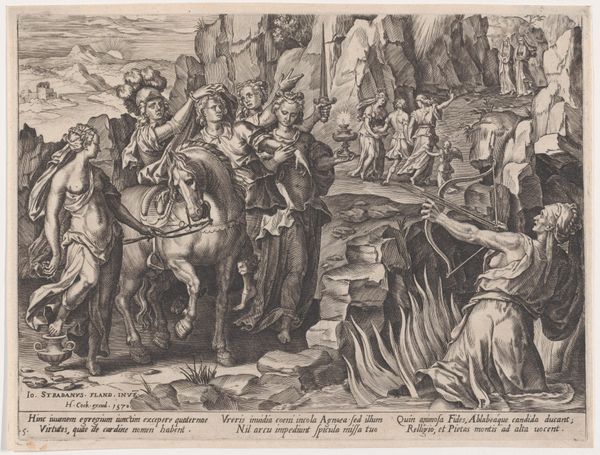 Editor: So, here we have Pieter Jalhea Furnius' engraving from 1570, "Youth, from 'The Course of Human Life'." The whole scene feels like a stage, doesn't it? All these figures frozen in place. What historical and social forces do you see at play in a piece like this? Curator: Well, this print really captures a moment steeped in the anxieties of its time. We’re seeing the allegorical figure of Time ushering Youth, this almost reluctant figure, forward. But from what, and to what end? The Northern Renaissance was grappling with new ideas, scientific discoveries challenging old belief systems. Consider the rising merchant class, eager to display wealth and status through art, but still wrestling with religious doctrines. Does this composition then reflect the uncertainty of progress in the face of morality? Editor: That makes a lot of sense. It's like Youth is being pushed towards a destiny they aren't quite ready for. I wonder what those figures in the back represent? Are they also being hurried along? Curator: Exactly! They’re part of that inexorable flow. What do you think of the classical references alongside these forward-marching figures? The Roman god Proteus is leading the charge astride those magnificent steeds, suggesting that maybe we need to explore power structures at play and their effects upon society. Editor: That’s fascinating, placing it within the socio-political framework like that, emphasizing societal influences that drive history and people in this period. So this image represents a kind of collision between classical ideals and contemporary anxieties? Curator: Precisely! And that tension, that unresolved negotiation between the past and future, the individual and society, continues to resonate with us today. Editor: This has given me so much to think about. I'm starting to see how much context matters. Thanks for unpacking that. Curator: Absolutely. Thinking about context creates awareness, and that opens our minds to new ideas, perspectives and the nuances present.