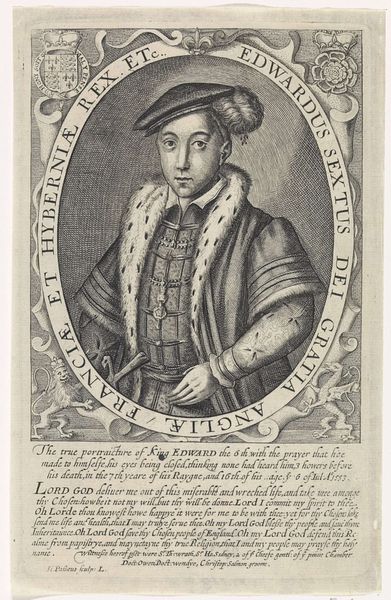 Curator: Here we have Simon van de Passe’s “Portrait of Charles I,” made after 1612. It's an engraving. Looking at it, what comes to mind for you? Editor: Melancholy. Something about the starkness of the line work, that intense gaze. There's a weight here, especially considering it was done when he was still quite young, before all the... unfortunate events. Curator: Indeed. The material, engraving, allowed for relatively widespread dissemination of the royal image. These prints served as potent tools for shaping public perception of the monarchy, projecting authority and… legitimacy. Think about the labor involved: the engraver meticulously transferring the likeness to a metal plate. Editor: It's fascinating to think about the layers of reproduction—the original painting (of which this is a copy) which no doubt involved the sitter and painter’s self-fashioning and promotion; the work of the engraver, then the distribution to a much wider audience via the print. Also, to create this image, the metal plate was crucial, it would have been so difficult. It looks like very hard work. Curator: Exactly, and consider the inscriptions, that elaborate oval cartouche in Latin around the figure. Each word, each title, "Prince of Wales," "Duke of Cornwall," adding to the projection of power, and future kingship, don’t forget. Van de Passe wasn’t just making a likeness; he was participating in a grand, carefully orchestrated PR campaign, in a sense. Editor: PR that met with… well, mixed results! Seeing this now, knowing how it all ended, there’s an undeniable irony, a sense of foreshadowing perhaps. The crisp, almost cold lines seem to amplify the sense of doomed grandeur. It is also kind of cold: not very personal at all. Curator: But perhaps that chilliness was part of the point, distancing the monarchy from the messy realities of everyday life, creating a figure of reverence and… fear, I’m sorry, respect! It really makes one wonder about the power dynamics inherent in the image-making of the time. What price visibility? Editor: It really shows a different dimension to how art reflects history beyond just pretty portraits, looking into power, propaganda and, indeed, doomed grandeur. Thanks. Curator: Agreed. The story is really there embedded in the material of its production.